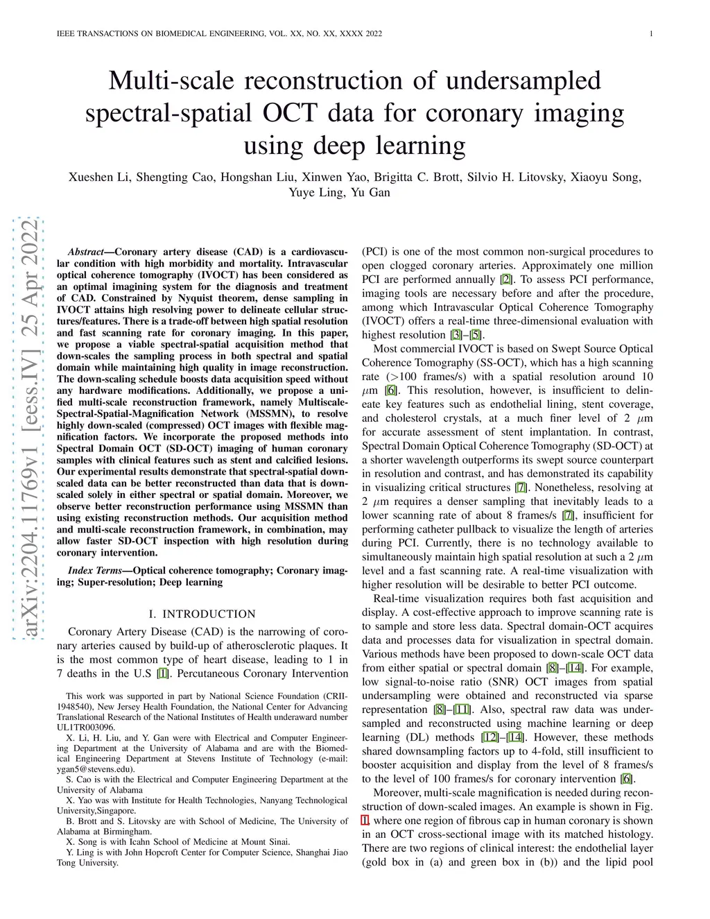 Coronary artery disease (CAD) is a cardiovascular condition with high morbidity and mortality. Intravascular optical coherence tomography (IVOCT) has been considered as an optimal imagining system for the diagnosis and treatment of CAD. Constrained by Nyquist theorem, dense sampling in IVOCT attains high resolving power to delineate cellular structures/ features. There is a trade-off between high spatial resolution and fast scanning rate for coronary imaging. In this paper, we propose a viable spectral-spatial acquisition method that down-scales the sampling process in both spectral and spatial domain while maintaining high quality in image reconstruction. The down-scaling schedule boosts data acquisition speed without any hardware modifications. Additionally, we propose a unified multi-scale reconstruction framework, namely Multiscale- Spectral-Spatial-Magnification Network (MSSMN), to resolve highly down-scaled (compressed) OCT images with flexible magnification factors. We incorporate the proposed methods into Spectral Domain OCT (SD-OCT) imaging of human coronary samples with clinical features such as stent and calcified lesions. Our experimental results demonstrate that spectral-spatial downscaled data can be better reconstructed than data that is downscaled solely in either spectral or spatial domain. Moreover, we observe better reconstruction performance using MSSMN than using existing reconstruction methods. Our acquisition method and multi-scale reconstruction framework, in combination, may allow faster SD-OCT inspection with high resolution during coronary intervention.
