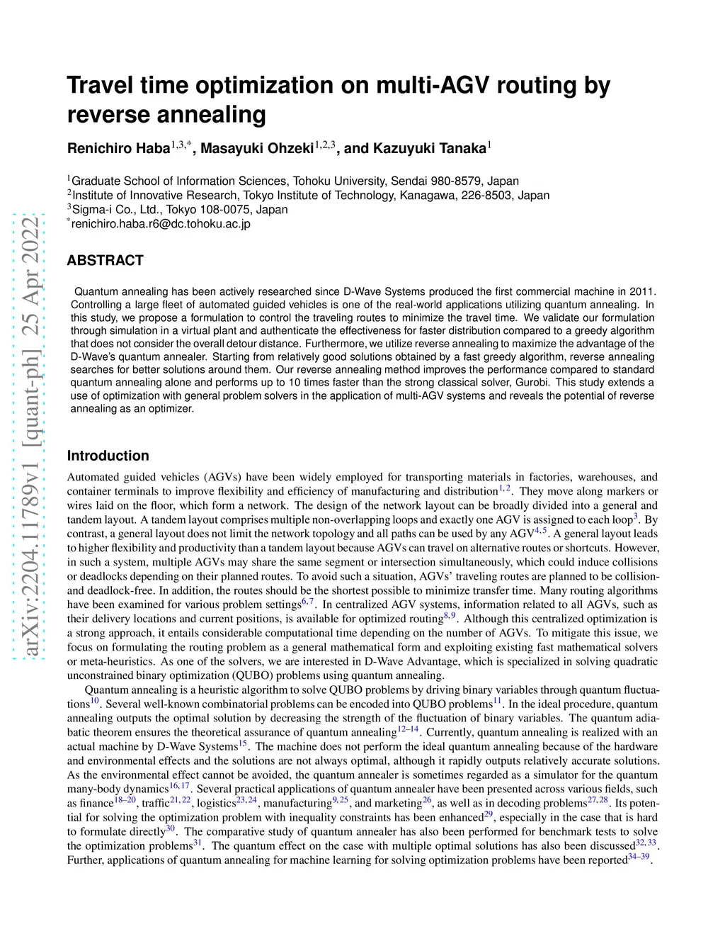 Travel time optimization on multi-AGV routing by reverse annealing