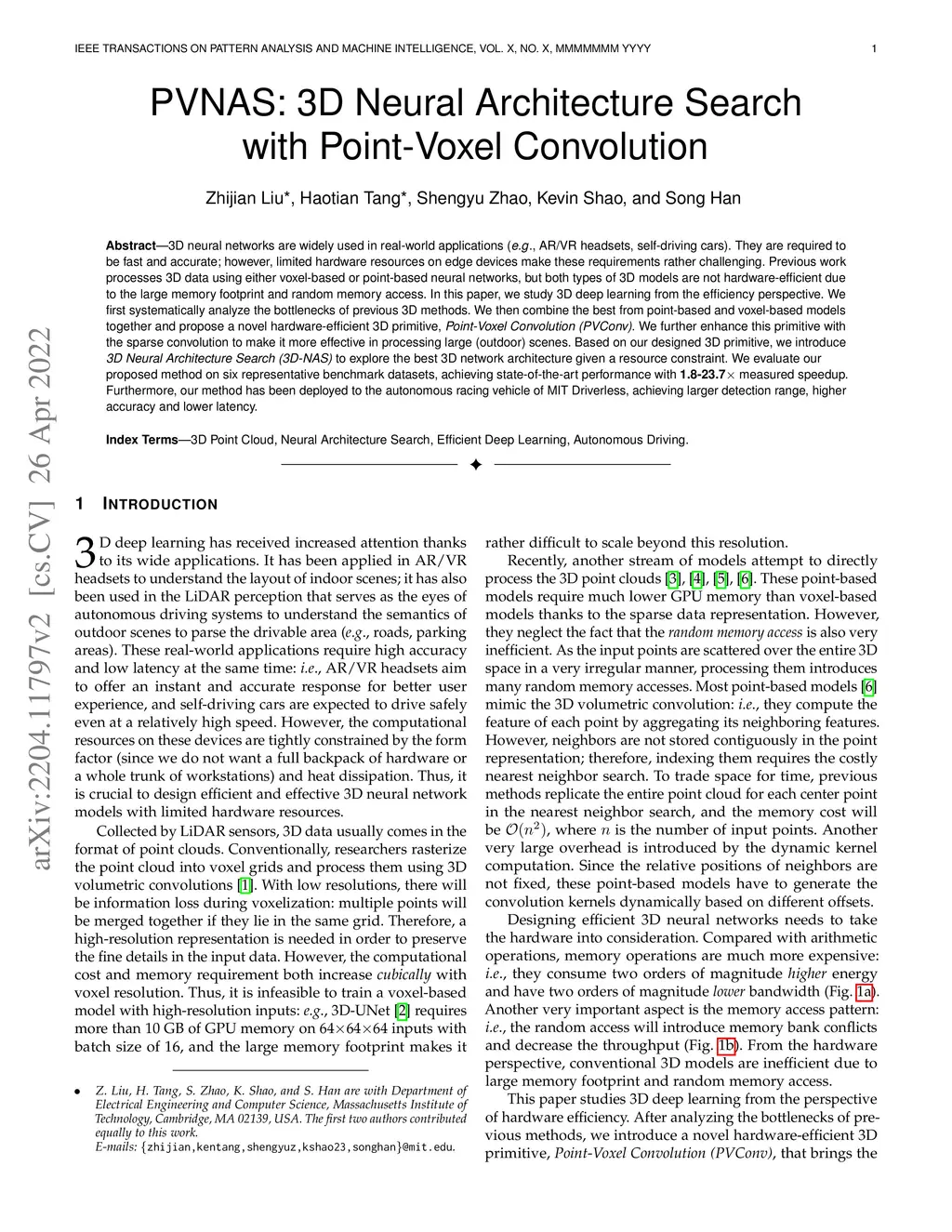 3D neural networks are widely used in real-world applications (e.g., AR/VR headsets, self-driving cars). They are required to be fast and accurate; however, limited hardware resources on edge devices make these requirements rather challenging. Previous work processes 3D data using either voxel-based or point-based neural networks, but both types of 3D models are not hardware-efficient due to the large memory footprint and random memory access. In this paper, we study 3D deep learning from the efficiency perspective. We first systematically analyze the bottlenecks of previous 3D methods. We then combine the best from point-based and voxel-based models together and propose a novel hardware-efficient 3D primitive, Point-Voxel Convolution (PVConv). We further enhance this primitive with the sparse convolution to make it more effective in processing large (outdoor) scenes. Based on our designed 3D primitive, we introduce 3D Neural Architecture Search (3D-NAS) to explore the best 3D network architecture given a resource constraint. We evaluate our proposed method on six representative benchmark datasets, achieving state-of-the-art performance with 1.8-23.7x measured speedup. Furthermore, our method has been deployed to the autonomous racing vehicle of MIT Driverless, achieving larger detection range, higher accuracy and lower latency.