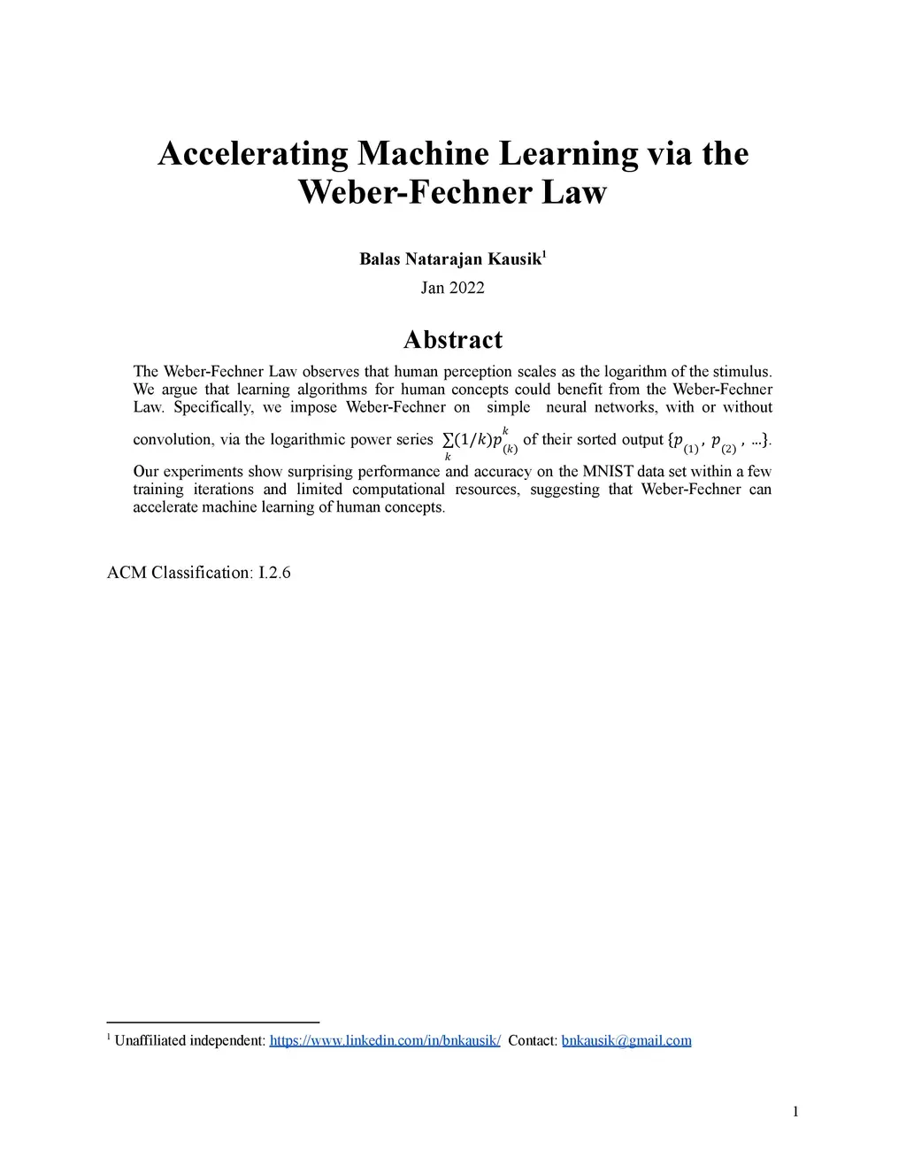 The Weber-Fechner Law observes that human perception scales as the logarithm of the stimulus. We argue that learning algorithms for human concepts could benefit from the Weber-Fechner Law. Specifically, we impose Weber-Fechner on simple neural networks, with or without convolution, via the logarithmic power series of their sorted output. Our experiments show surprising performance and accuracy on the MNIST data set within a few training iterations and limited computational resources, suggesting that Weber-Fechner can accelerate machine learning of human concepts.