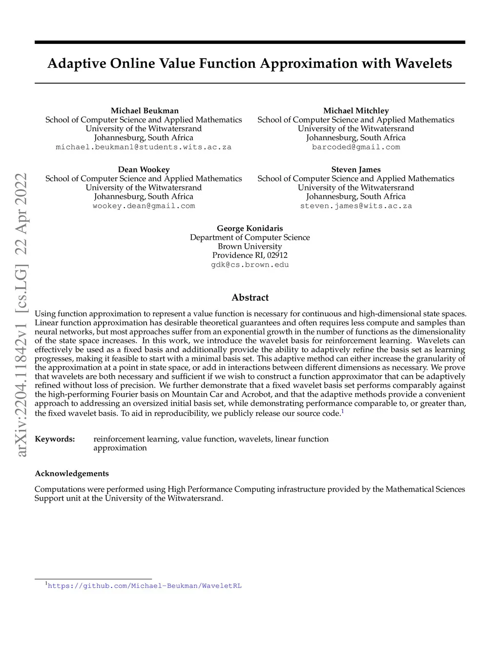 Using function approximation to represent a value function is necessary for continuous and high-dimensional state spaces. Linear function approximation has desirable theoretical guarantees and often requires less compute and samples than neural networks, but most approaches suffer from an exponential growth in the number of functions as the dimensionality of the state space increases. In this work, we introduce the wavelet basis for reinforcement learning. Wavelets can effectively be used as a fixed basis and additionally provide the ability to adaptively refine the basis set as learning progresses, making it feasible to start with a minimal basis set. This adaptive method can either increase the granularity of the approximation at a point in state space, or add in interactions between different dimensions as necessary. We prove that wavelets are both necessary and sufficient if we wish to construct a function approximator that can be adaptively refined without loss of precision. We further demonstrate that a fixed wavelet basis set performs comparably against the high-performing Fourier basis on Mountain Car and Acrobot, and that the adaptive methods provide a convenient approach to addressing an oversized initial basis set, while demonstrating performance comparable to, or greater than, the fixed wavelet basis.