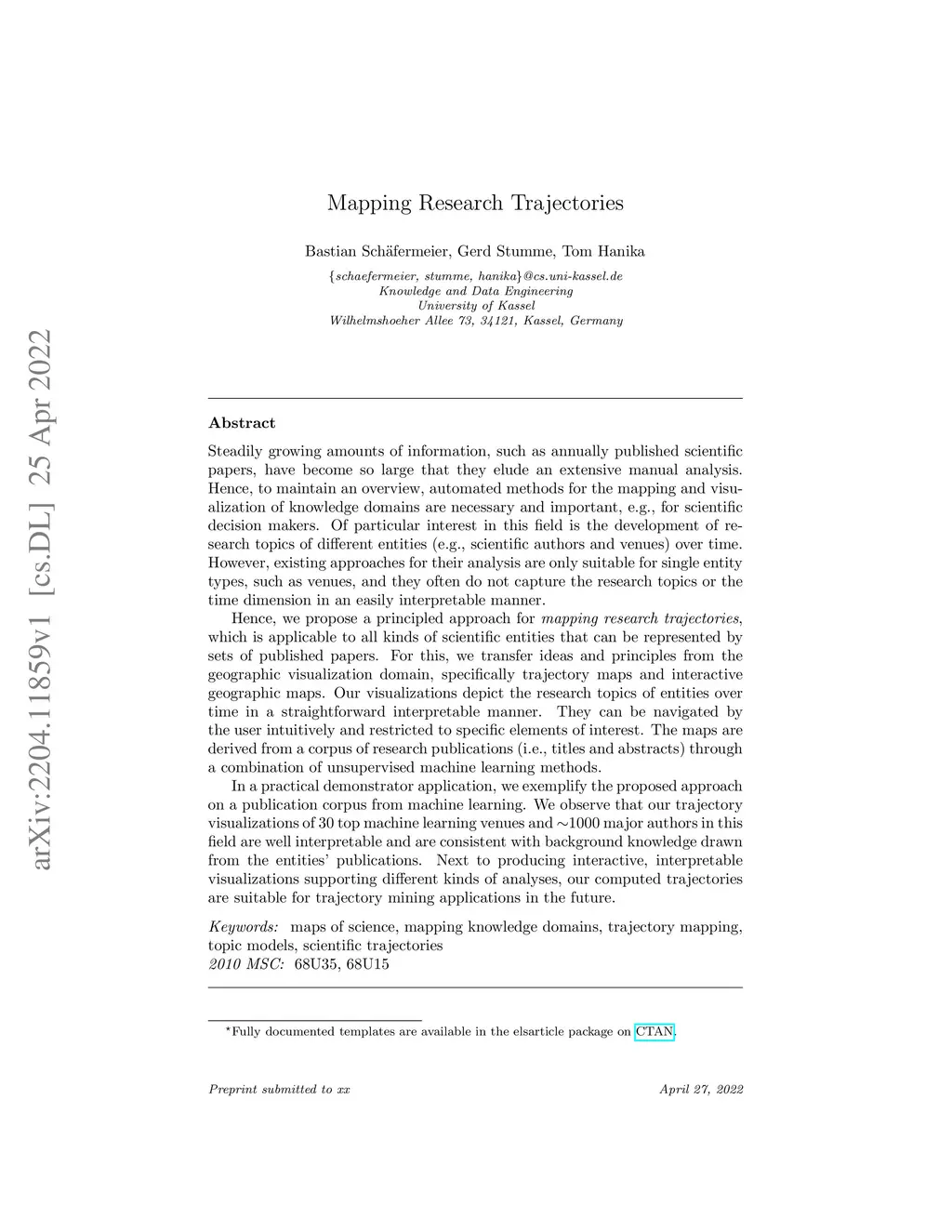 Steadily growing amounts of information, such as annually published scientific papers, have become so large that they elude an extensive manual analysis. Hence, to maintain an overview, automated methods for the mapping and visualization of knowledge domains are necessary and important, e.g., for scientific decision makers. Of particular interest in this field is the development of research topics of different entities (e.g., scientific authors and venues) over time. However, existing approaches for their analysis are only suitable for single entity types, such as venues, and they often do not capture the research topics or the time dimension in an easily interpretable manner. Hence, we propose a principled approach for \emph{mapping research trajectories}, which is applicable to all kinds of scientific entities that can be represented by sets of published papers. For this, we transfer ideas and principles from the geographic visualization domain, specifically trajectory maps and interactive geographic maps. Our visualizations depict the research topics of entities over time in a straightforward interpr. manner. They can be navigated by the user intuitively and restricted to specific elements of interest. The maps are derived from a corpus of research publications (i.e., titles and abstracts) through a combination of unsupervised machine learning methods. In a practical demonstrator application, we exemplify the proposed approach on a publication corpus from machine learning. We observe that our trajectory visualizations of 30 top machine learning venues and 1000 major authors in this field are well interpretable and are consistent with background knowledge drawn from the entities' publications. Next to producing interactive, interpr. visualizations supporting different kinds of analyses, our computed trajectories are suitable for trajectory mining applications in the future.