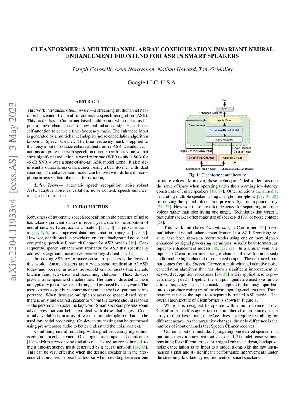 This work introduces the Cleanformer, a streaming multichannel neural based enhancement frontend for automatic speech recognition (ASR). This model has a conformer-based architecture which takes as inputs a single channel each of raw and enhanced signals, and uses self-attention to derive a time-frequency mask. The enhanced input is generated by a multichannel adaptive noise cancellation algorithm known as Speech Cleaner, which makes use of noise context to derive its filter taps. The time-frequency mask is applied to the noisy input to produce enhanced output features for ASR. Detailed evaluations are presented with simulated and re-recorded datasets in speech-based and non-speech-based noise that show significant reduction in word error rate (WER) when using a large-scale state-of-the-art ASR model. It also will be shown to significantly outperform enhancement using a beamformer with ideal steering. The enhancement model is agnostic of the number of microphones and array configuration and, therefore, can be used with different microphone arrays without the need for retraining. It is demonstrated that performance improves with more microphones, up to 4, with each additional microphone providing a smaller marginal benefit. Specifically, for an SNR of -6dB, relative WER improvements of about 80\% are shown in both noise conditions.