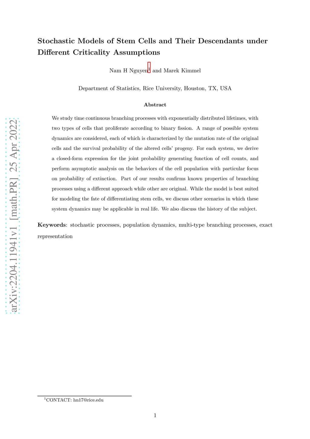 Stochastic Models of Stem Cells and Their Descendants under Different