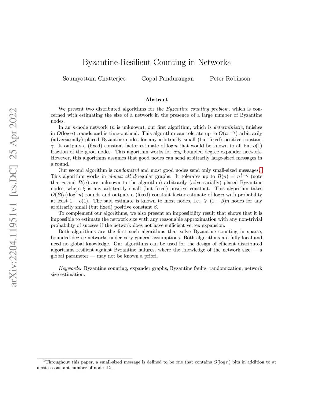 We present two distributed algorithms for the {\em Byzantine counting problem}, which is concerned with estimating the size of a network in the presence of a large number of Byzantine nodes. In an -node network ( is unknown), our first algorithm, which is {\em deterministic}, finishes in rounds and is time-optimal. This algorithm can tolerate up to arbitrarily (adversarially) placed Byzantine nodes for any arbitrarily small (but fixed) positive constant . It outputs a (fixed) constant factor estimate of that would be known to all but fraction of the good nodes. This algorithm works for \emph{any} bounded degree expander network. However, this algorithms assumes that good nodes can send arbitrarily large-sized messages in a round. Our second algorithm is {\em randomized} and most good nodes send only small-sized messages (Throughout this paper, a small-sized message is defined to be one that contains bits in addition to at most a constant number of node IDs.). This algorithm works in \emph{almost all} -regular graphs. It tolerates up to (note that and are unknown to the algorithm) arbitrarily (adversarially) placed Byzantine nodes, where is any arbitrarily small (but fixed) positive constant. This algorithm takes rounds and outputs a (fixed) constant factor estimate of with probability at least . The said estimate is known to most nodes, i.e., nodes for any arbitrarily small (but fixed) positive constant . To complement our algorithms, we also present an impossibility result that shows that it is impossible to estimate the network size with any reasonable approximation with any non-trivial probability of success if the network does not have sufficient vertex expansion.