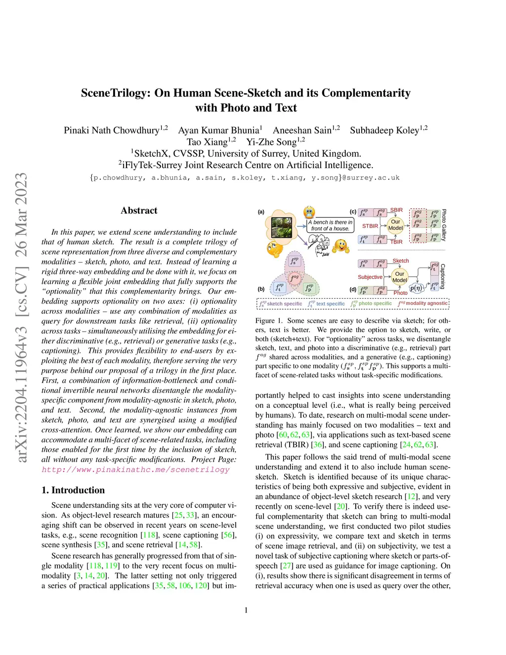 In this paper, we extend scene understanding to include that of human sketch. The result is a complete trilogy of scene representation from three diverse and complementary modalities -- sketch, photo, and text. Instead of learning a rigid three-way embedding and be done with it, we focus on learning a flexible joint embedding that fully supports the ``optionality" that this complementarity brings. Our embedding supports optionality on two axes: (i) optionality across modalities -- use any combination of modalities as query for downstream tasks like retrieval, (ii) optionality across tasks -- simultaneously utilising the embedding for either discriminative (e.g., retrieval) or generative tasks (e.g., captioning). This provides flexibility to end-users by exploiting the best of each modality, therefore serving the very purpose behind our proposal of a trilogy in the first place. First, a combination of information-bottleneck and conditional invertible neural networks disentangle the modality-specific component from modality-agnostic in sketch, photo, and text. Second, the modality-agnostic instances from sketch, photo, and text are synergised using a modified cross-attention. Once learned, we show our embedding can accommodate a multi-facet of scene-related tasks, including those enabled for the first time by the inclusion of sketch, all without any task-specific modifications. Project Page: \url{http://www.pinakinathc.me/scenetrilogy}