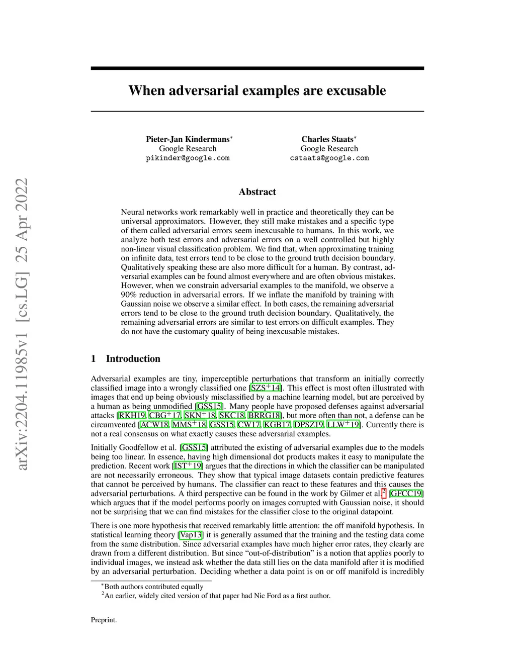 Neural networks work remarkably well in practice and theoretically they can be universal approximators. However, they still make mistakes and a specific type of them called adversarial errors seem inexcusable to humans. In this work, we analyze both test errors and adversarial errors on a well controlled but highly non-linear visual classification problem. We find that, when approximating training on infinite data, test errors tend to be close to the ground truth decision boundary. Qualitatively speaking these are also more difficult for a human. By contrast, adversarial examples can be found almost everywhere and are often obvious mistakes. However, when we constrain adversarial examples to the manifold, we observe a 90\% reduction in adversarial errors. If we inflate the manifold by training with Gaussian noise we observe a similar effect. In both cases, the remaining adversarial errors tend to be close to the ground truth decision boundary. Qualitatively, the remaining adversarial errors are similar to test errors on difficult examples. They do not have the customary quality of being inexcusable mistakes.