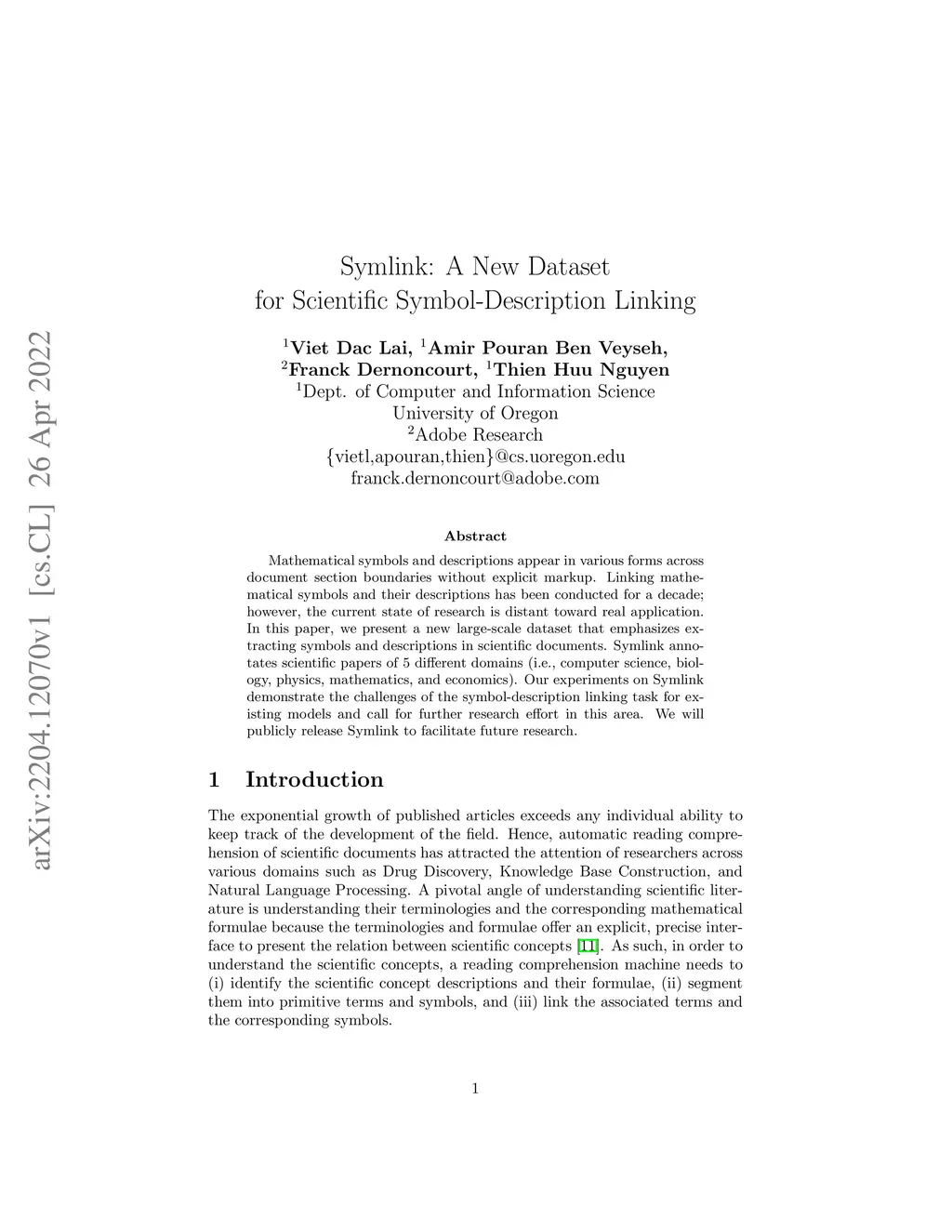 Mathematical symbols and descriptions appear in various forms across document section boundaries without explicit markup. In this paper, we present a new large-scale dataset that emphasizes extracting symbols and descriptions in scientific documents. Symlink annotates scientific papers of 5 different domains (i.e., computer science, biology, physics, mathematics, and economics). Our experiments on Symlink demonstrate the challenges of the symbol-description linking task for existing models and call for further research effort in this area. We will publicly release Symlink to facilitate future research.