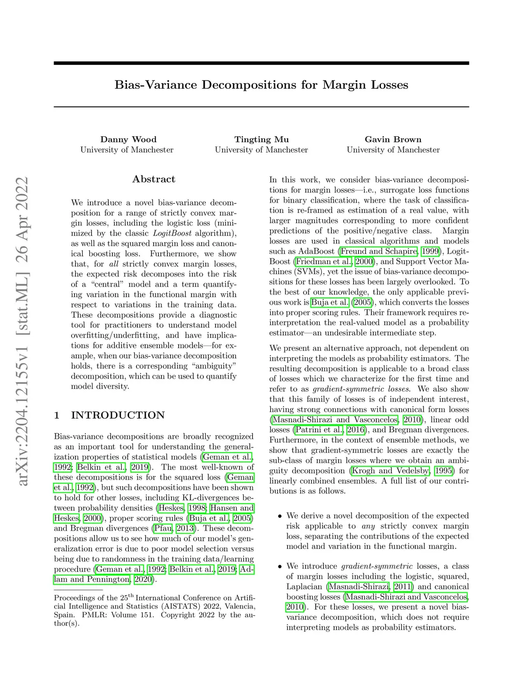 We introduce a novel bias-variance decomposition for a range of strictly convex margin losses, including the logistic loss (minimized by the classic LogitBoost algorithm), as well as the squared margin loss and canonical boosting loss. Furthermore, we show that, for all strictly convex margin losses, the expected risk decomposes into the risk of a "central" model and a term quantifying variation in the functional margin with respect to variations in the training data. These decompositions provide a diagnostic tool for practitioners to understand model overfitting/underfitting, and have implications for additive ensemble models -- for example, when our bias-variance decomposition holds, there is a corresponding "ambiguity" decomposition, which can be used to quantify model diversity.