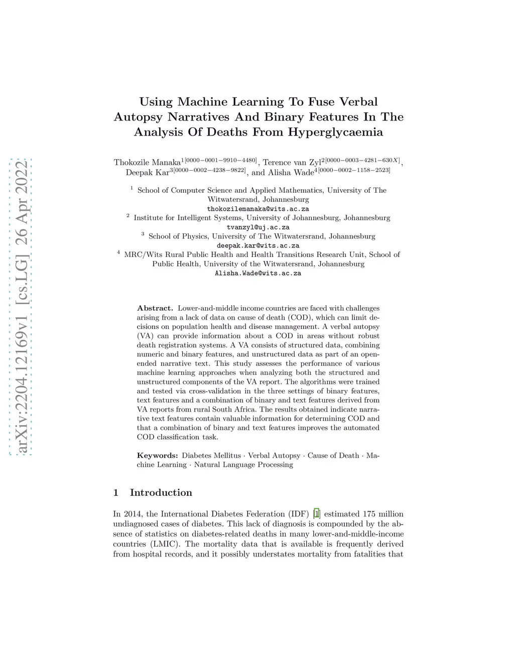 Lower-and-middle income countries are faced with challenges arising from a lack of data on cause of death (COD), which can limit decisions on population health and disease management. A verbal autopsy(VA) can provide information about a COD in areas without robust death registration systems. A VA consists of structured data, combining numeric and binary features, and unstructured data as part of an open-ended narrative text. This study assesses the performance of various machine learning approaches when analyzing both the structured and unstructured components of the VA report. The algorithms were trained and tested via cross-validation in the three settings of binary features, text features and a combination of binary and text features derived from VA reports from rural South Africa. The results obtained indicate narrative text features contain valuable information for determining COD and that a combination of binary and text features improves the automated COD classification task. Keywords: Diabetes Mellitus, Verbal Autopsy, Cause of Death, Machine Learning, Natural Language Processing