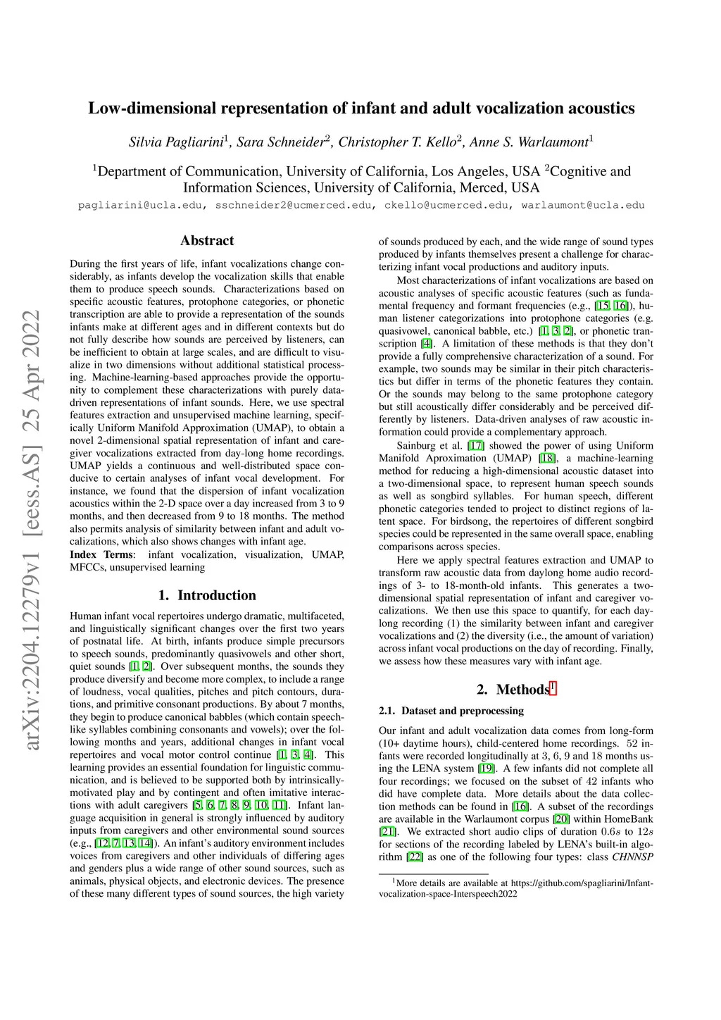 Low-dimensional representation of infant and adult vocalization