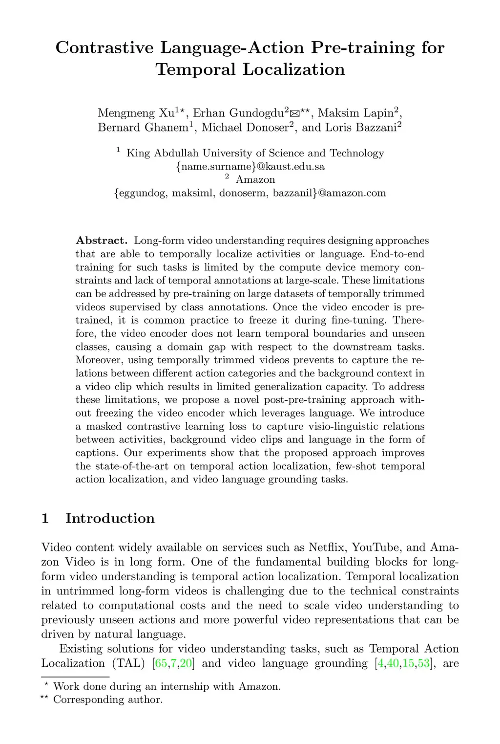 Long-form video understanding requires designing approaches that are able to temporally localize activities or language. End-to-end training for such tasks is limited by the compute device memory constraints and lack of temporal annotations at large-scale. These limitations can be addressed by pre-training on large datasets of temporally trimmed videos supervised by class annotations. Once the video encoder is pre-trained, it is common practice to freeze it during fine-tuning. Therefore, the video encoder does not learn temporal boundaries and unseen classes, causing a domain gap with respect to the downstream tasks. Moreover, using temporally trimmed videos prevents to capture the relations between different action categories and the background context in a video clip which results in limited generalization capacity. To address these limitations, we propose a novel post-pre-training approach without freezing the video encoder which leverages language. We introduce a masked contrastive learning loss to capture visio-linguistic relations between activities, background video clips and language in the form of captions. Our experiments show that the proposed approach improves the state-of-the-art on temporal action localization, few-shot temporal action localization, and video language grounding tasks.