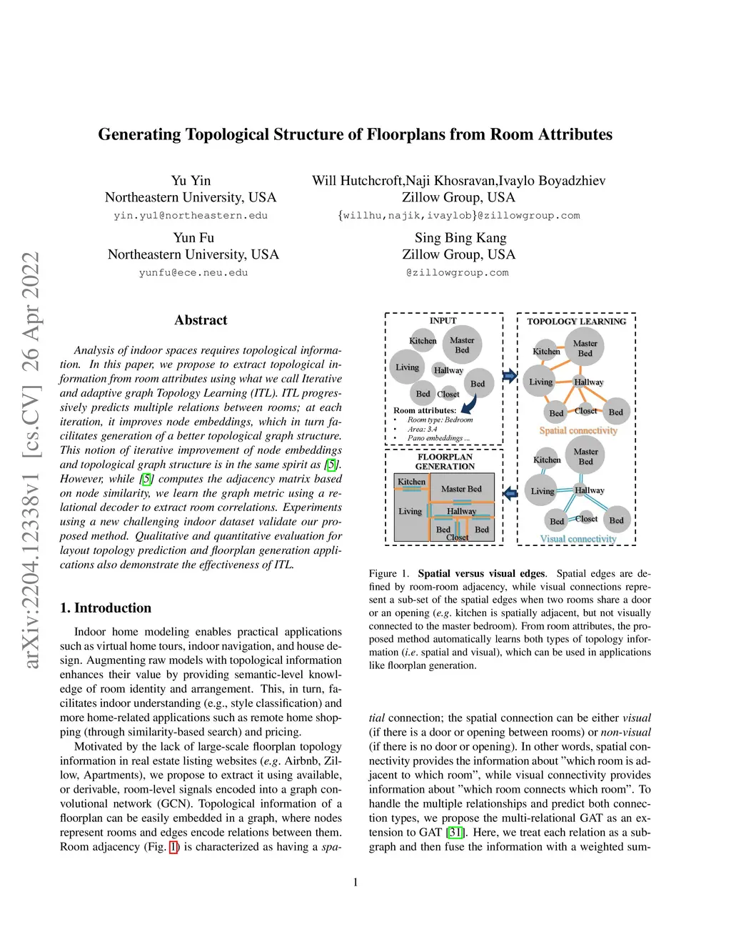 Analysis of indoor spaces requires topological information. In this paper, we propose to extract topological information from room attributes using what we call Iterative and adaptive graph Topology Learning (ITL). ITL progressively predicts multiple relations between rooms; at each iteration, it improves node embeddings, which in turn facilitates generation of a better topological graph structure. This notion of iterative improvement of node embeddings and topological graph structure is in the same spirit as \cite{chen2020iterative}. However, while \cite{chen2020iterative} computes the adjacency matrix based on node similarity, we learn the graph metric using a relational decoder to extract room correlations. Experiments using a new challenging indoor dataset validate our proposed method. Qualitative and quantitative evaluation for layout topology prediction and floorplan generation applications also demonstrate the effectiveness of ITL.