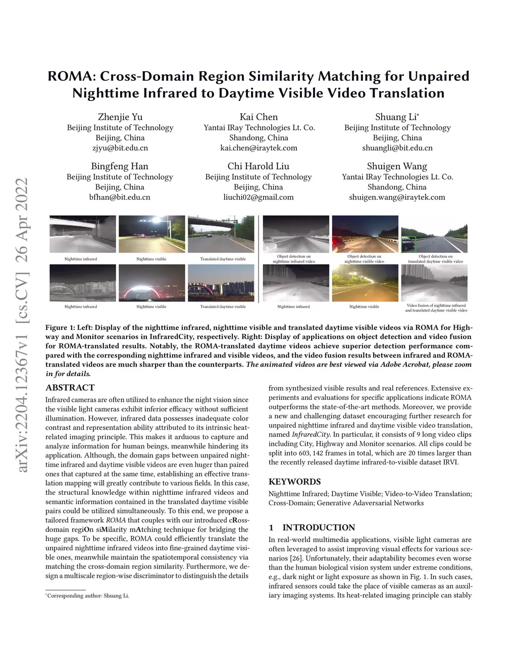 Infrared cameras are often utilized to enhance the night vision since the visible light cameras exhibit inferior efficacy without sufficient illumination. However, infrared data possesses inadequate color contrast and representation ability attributed to its intrinsic heat-related imaging principle. This makes it arduous to capture and analyze information for human beings, meanwhile hindering its application. Although, the domain gaps between unpaired nighttime infrared and daytime visible videos are even huger than paired ones that captured at the same time, establishing an effective translation mapping will greatly contribute to various fields. In this case, the structural knowledge within nighttime infrared videos and semantic information contained in the translated daytime visible pairs could be utilized simultaneously. To this end, we propose a tailored framework ROMA that couples with our introduced cRoss-domain regiOn siMilarity mAtching technique for bridging the huge gaps. To be specific, ROMA could efficiently translate the unpaired nighttime infrared videos into fine-grained daytime visible ones, meanwhile maintain the spatiotemporal consistency via matching the cross-domain region similarity. Furthermore, we design a multiscale region-wise discriminator to distinguish the details from synthesized visible results and real references. Extensive experiments and evaluations for specific applications indicate ROMA outperforms the state-of-the-art methods. Moreover, we provide a new and challenging dataset encouraging further research for unpaired nighttime infrared and daytime visible video translation, named InfraredCity. In particular, it consists of 9 long video clips including City, Highway and Monitor scenarios. All clips could be split into 603,142 frames in total, which are 20 times larger than the recently released daytime infrared-to-visible dataset IRVI.