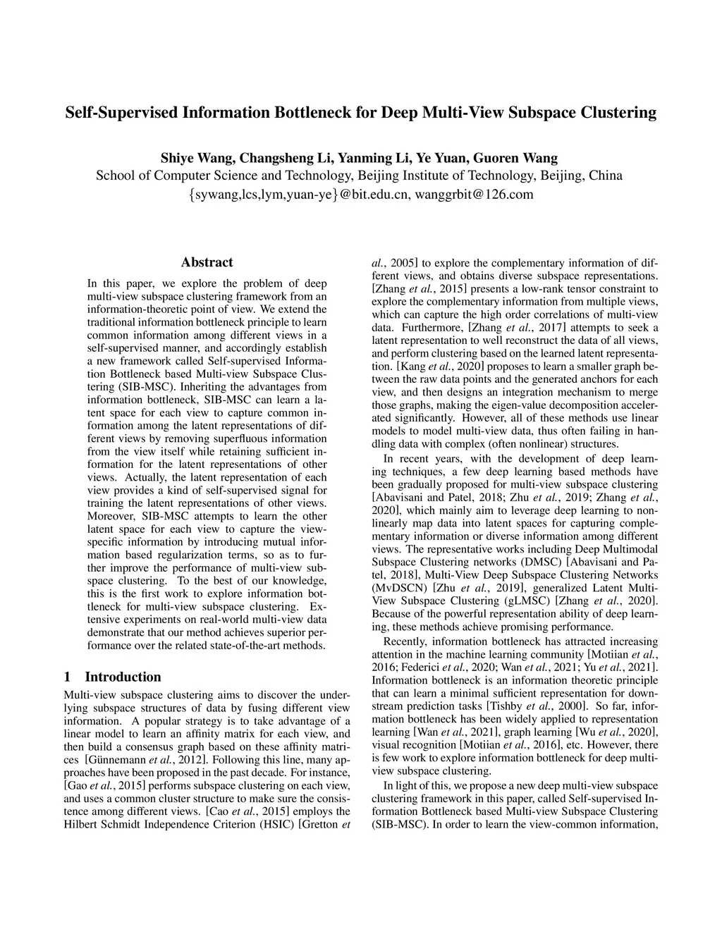 Self-Supervised Information Bottleneck for Deep Multi-View Subspace