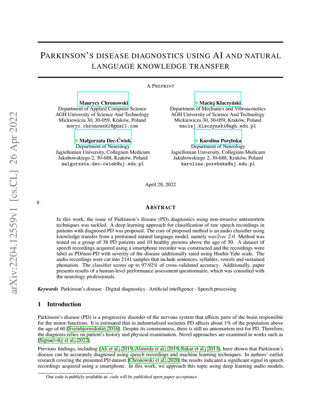 Parkinson's disease diagnostics using AI and natural language knowledge