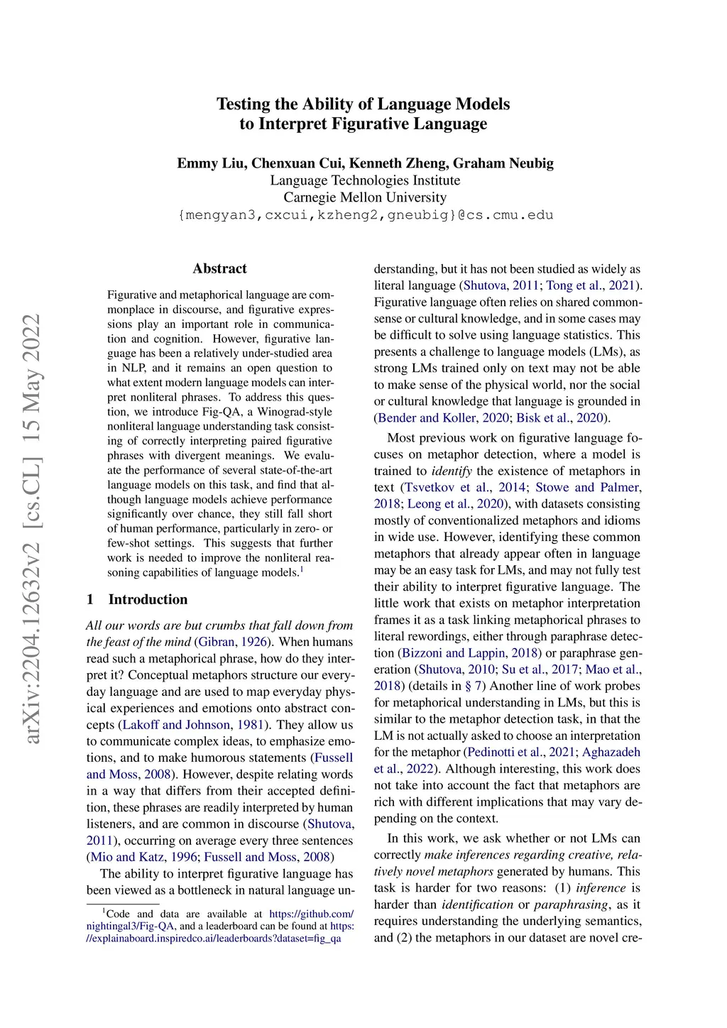 Figurative and metaphorical language are commonplace in discourse, and figurative expressions play an important role in communication and cognition. However, figurative language has been a relatively under-studied area in NLP, and it remains an open question to what extent modern language models can interpret nonliteral phrases. To address this question, we introduce Fig-QA, a Winograd-style nonliteral language understanding task consisting of correctly interpreting paired figurative phrases with divergent meanings. We evaluate the performance of several state-of-the-art language models on this task, and find that although language models achieve performance significantly over chance, they still fall short of human performance, particularly in zero- or few-shot settings. This suggests that further work is needed to improve the nonliteral reasoning capabilities of language models.