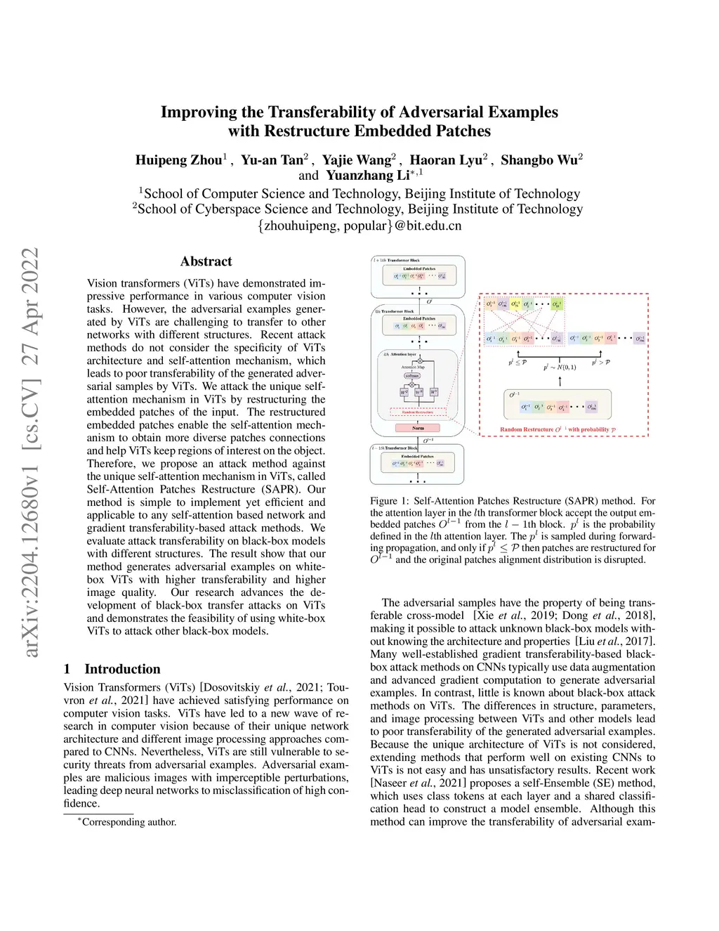 Vision transformers (ViTs) have demonstrated impressive performance in various computer vision tasks. However, the adversarial examples generated by ViTs are challenging to transfer to other networks with different structures. Recent attack methods do not consider the specificity of ViTs architecture and self-attention mechanism, which leads to poor transferability of the generated adversarial samples by ViTs. We attack the unique self-attention mechanism in ViTs by restructuring the embedded patches of the input. The restructured embedded patches enable the self-attention mechanism to obtain more diverse patches connections and help ViTs keep regions of interest on the object. Therefore, we propose an attack method against the unique self-attention mechanism in ViTs, called Self-Attention Patches Restructure (SAPR). Our method is simple to implement yet efficient and applicable to any self-attention based network and gradient transferability-based attack methods. We evaluate attack transferability on black-box models with different structures. The result show that our method generates adversarial examples on white-box ViTs with higher transferability and higher image quality. Our research advances the development of black-box transfer attacks on ViTs and demonstrates the feasibility of using white-box ViTs to attack other black-box models.