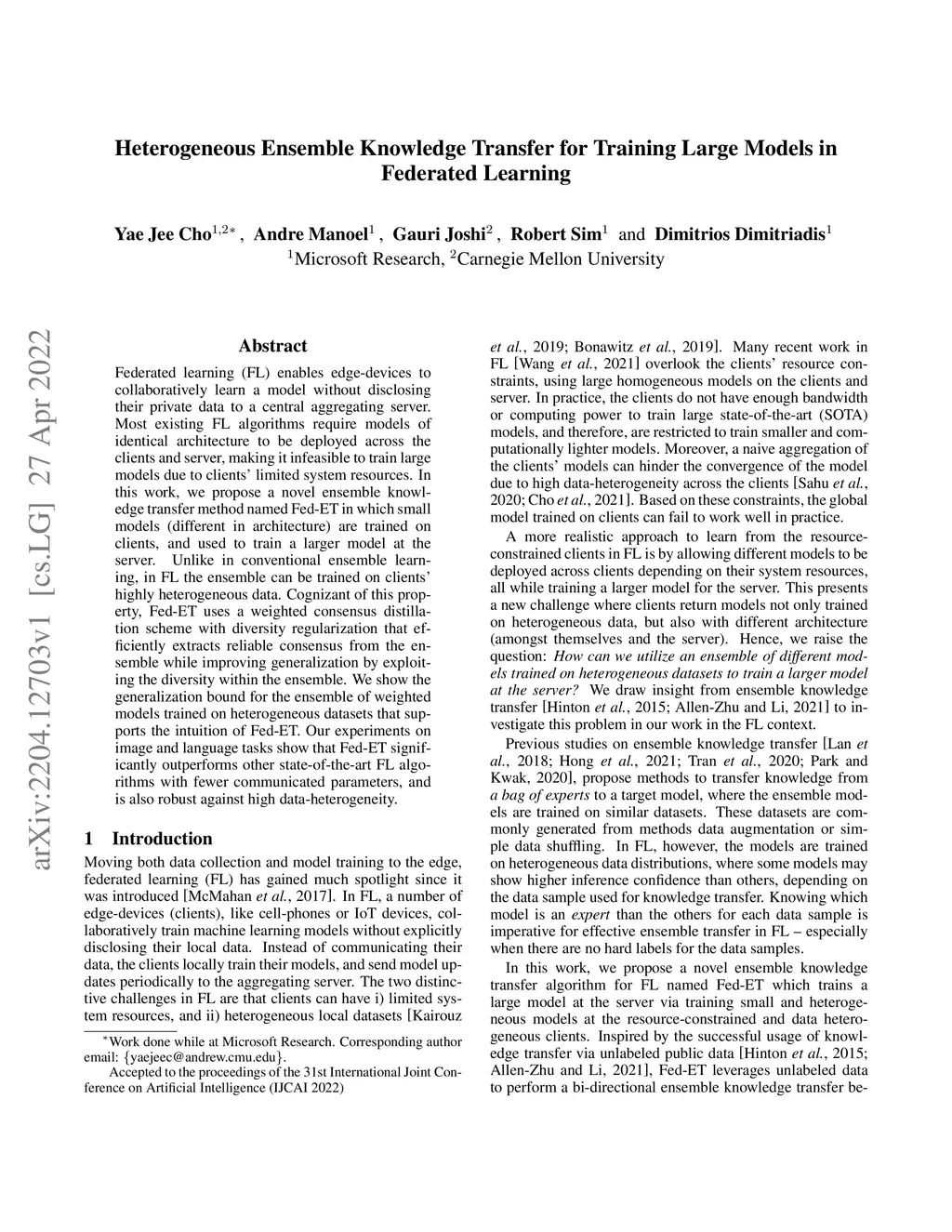 Federated learning (FL) enables edge-devices to collaboratively learn a model without disclosing their private data to a central aggregating server. Most existing FL algorithms require models of identical architecture to be deployed across the clients and server, making it infeasible to train large models due to clients' limited system resources. In this work, we propose a novel ensemble knowledge transfer method named Fed-ET in which small models (different in architecture) are trained on clients, and used to train a larger model at the server. Unlike in conventional ensemble learning, in FL the ensemble can be trained on clients' highly heterogeneous data. Cognizant of this property, Fed-ET uses a weighted consensus distillation scheme with diversity regularization that efficiently extracts reliable consensus from the ensemble while improving generalization by exploiting the diversity within the ensemble. We show the generalization bound for the ensemble of weighted models trained on heterogeneous datasets that supports the intuition of Fed-ET. Our experiments on image and language tasks show that Fed-ET significantly outperforms other state-of-the-art FL algorithms with fewer communicated parameters, and is also robust against high data-heterogeneity.