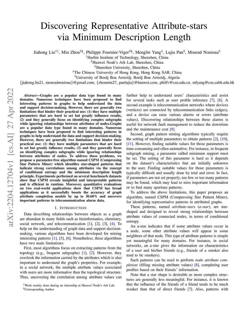 Graphs are a popular data type found in many domains. Numerous techniques have been proposed to find interesting patterns in graphs to help understand the data and support decision-making. However, there are generally two limitations that hinder their practical use: (1) they have multiple parameters that are hard to set but greatly influence results, (2) and they generally focus on identifying complex subgraphs while ignoring relationships between attributes of nodes.Graphs are a popular data type found in many domains. Numerous techniques have been proposed to find interesting patterns in graphs to help understand the data and support decision-making. However, there are generally two limitations that hinder their practical use: (1) they have multiple parameters that are hard to set but greatly influence results, (2) and they generally focus on identifying complex subgraphs while ignoring relationships between attributes of nodes. To address these problems, we propose a parameter-free algorithm named CSPM (Compressing Star Pattern Miner) which identifies star-shaped patterns that indicate strong correlations among attributes via the concept of conditional entropy and the minimum description length principle. Experiments performed on several benchmark datasets show that CSPM reveals insightful and interpretable patterns and is efficient in runtime. Moreover, quantitative evaluations on two real-world applications show that CSPM has broad applications as it successfully boosts the accuracy of graph attribute completion models by up to 30.68\% and uncovers important patterns in telecommunication alarm data.