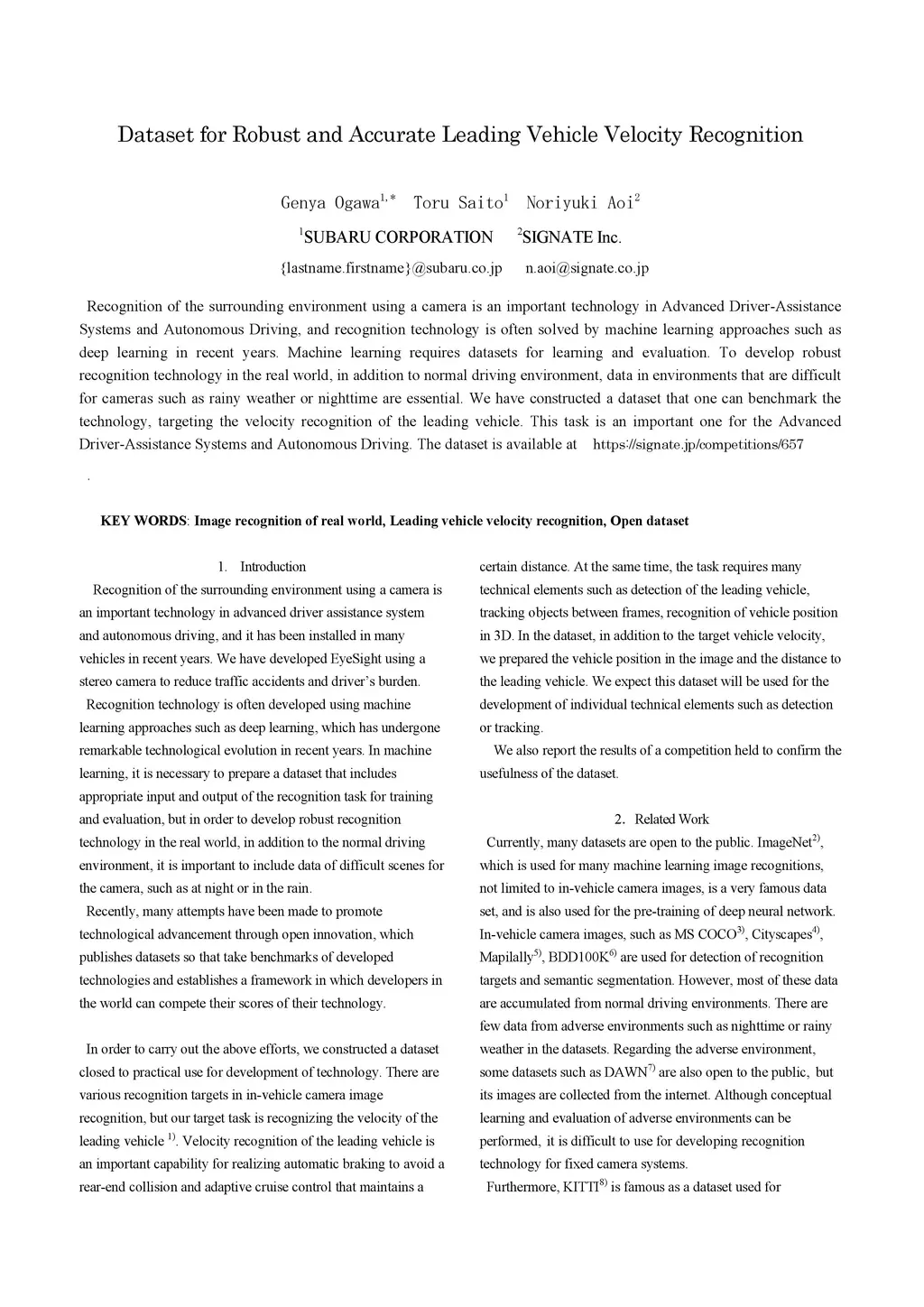 Dataset for Robust and Accurate Leading Vehicle Velocity Recognition