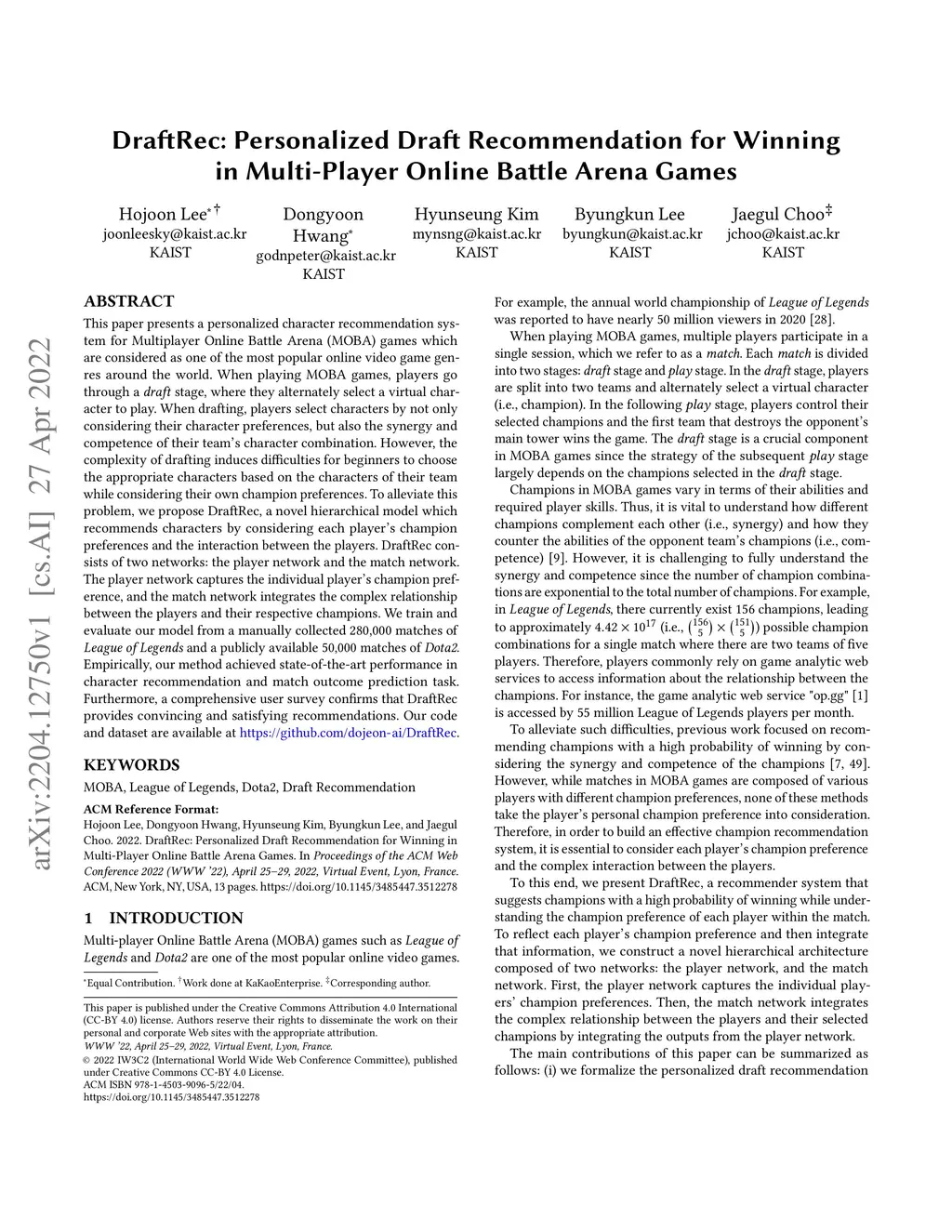 DraftRec: Personalized Draft Recommendation for Winning in Multi-Player