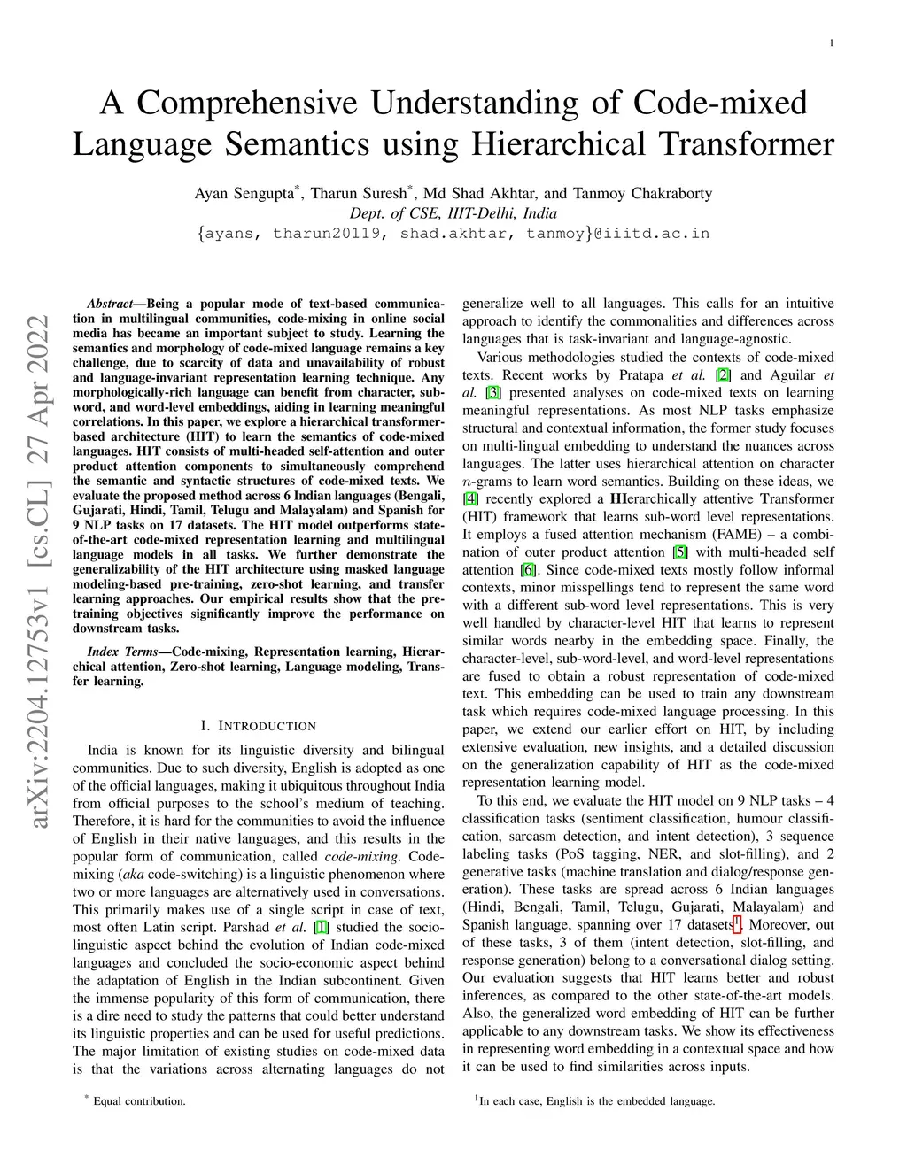 Being a popular mode of text-based communication in multilingual communities, code-mixing in online social media has became an important subject to study. Learning the semantics and morphology of code-mixed language remains a key challenge, due to scarcity of data and unavailability of robust and language-invariant representation learning technique. Any morphologically-rich language can benefit from character, subword, and word-level embeddings, aiding in learning meaningful correlations. In this paper, we explore a hierarchical transformer-based architecture (HIT) to learn the semantics of code-mixed languages. HIT consists of multi-headed self-attention and outer product attention components to simultaneously comprehend the semantic and syntactic structures of code-mixed texts. We evaluate the proposed method across 6 Indian languages (Bengali, Gujarati, Hindi, Tamil, Telugu and Malayalam) and Spanish for 9 NLP tasks on 17 datasets. The HIT model outperforms state-of-the-art code-mixed representation learning and multilingual language models in all tasks. We further demonstrate the generalizability of the HIT architecture using masked language modeling-based pre-training, zero-shot learning, and transfer learning approaches. Our empirical results show that the pre-training objectives significantly improve the performance on downstream tasks.