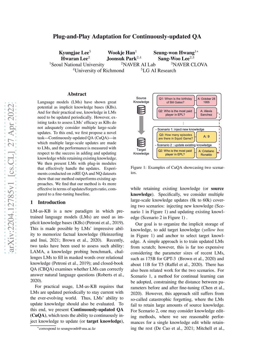 Language models (LMs) have shown great potential as implicit knowledge bases (KBs). And for their practical use, knowledge in LMs need to be updated periodically. However, existing tasks to assess LMs' efficacy as KBs do not adequately consider multiple large-scale updates. To this end, we first propose a novel task--Continuously-updated QA (CuQA)--in which multiple large-scale updates are made to LMs, and the performance is measured with respect to the success in adding and updating knowledge while retaining existing knowledge. We then present LMs with plug-in modules that effectively handle the updates. Experiments conducted on zsRE QA and NQ datasets show that our method outperforms existing approaches. We find that our method is 4x more effective in terms of updates/forgets ratio, compared to a fine-tuning baseline.
