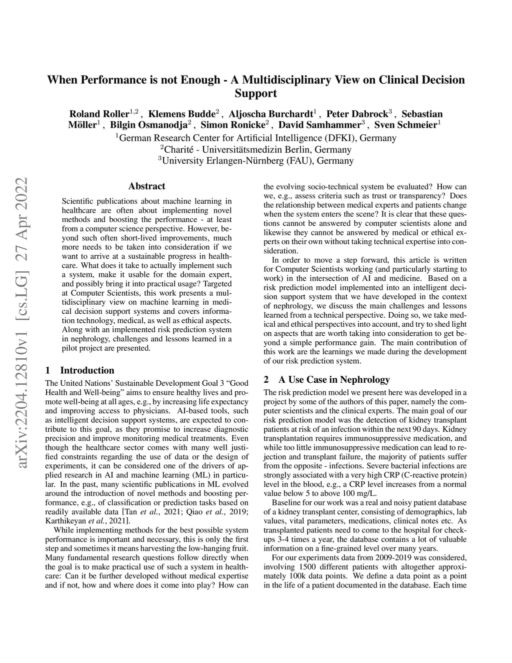Scientific publications about machine learning in healthcare are often about implementing novel methods and boosting the performance - at least from a computer science perspective. However, beyond such often short-lived improvements, much more needs to be taken into consideration if we want to arrive at a sustainable progress in healthcare. What does it take to actually implement such a system, make it usable for the domain expert, and possibly bring it into practical usage? Targeted at Computer Scientists, this work presents a multidisciplinary view on machine learning in medical decision support systems and covers information technology, medical, as well as ethical aspects. Along with an implemented risk prediction system in nephrology, challenges and lessons learned in a pilot project are presented.
