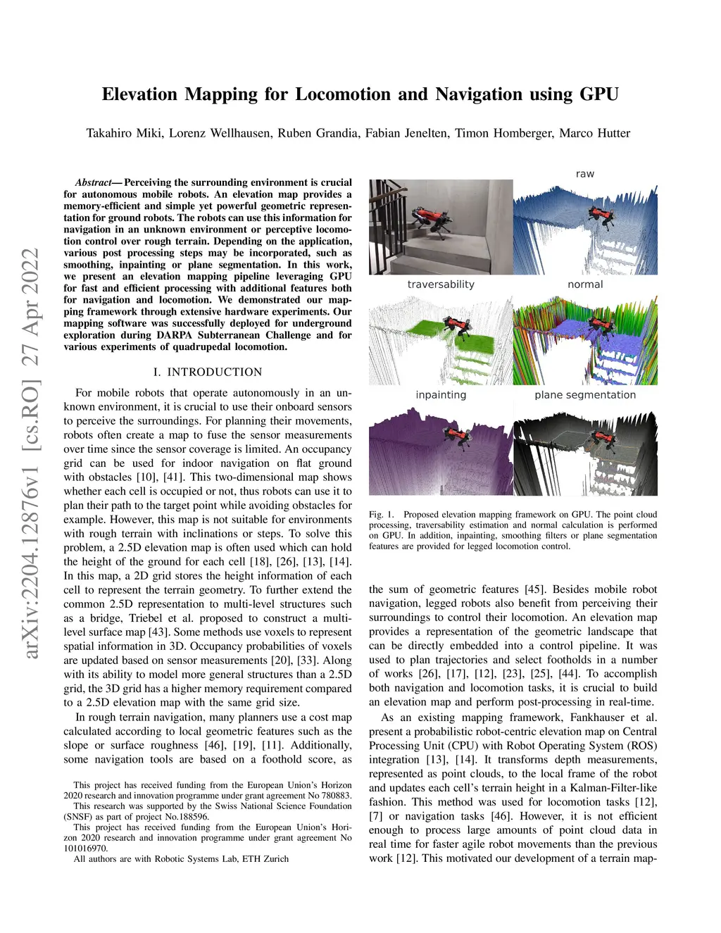 Perceiving the surrounding environment is crucial for autonomous mobile robots. An elevation map provides a memory-efficient and simple yet powerful geometric representation for ground robots. The robots can use this information for navigation in an unknown environment or perceptive locomotion control over rough terrain. Depending on the application, various post processing steps may be incorporated, such as smoothing, inpainting or plane segmentation. In this work, we present an elevation mapping pipeline leveraging GPU for fast and efficient processing with additional features both for navigation and locomotion. We demonstrated our mapping framework through extensive hardware experiments. Our mapping software was successfully deployed for underground exploration during DARPA Subterranean Challenge and for various experiments of quadrupedal locomotion.