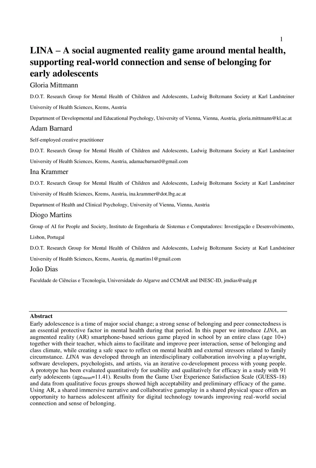 LINA -- A social augmented reality game around mental health, supporting