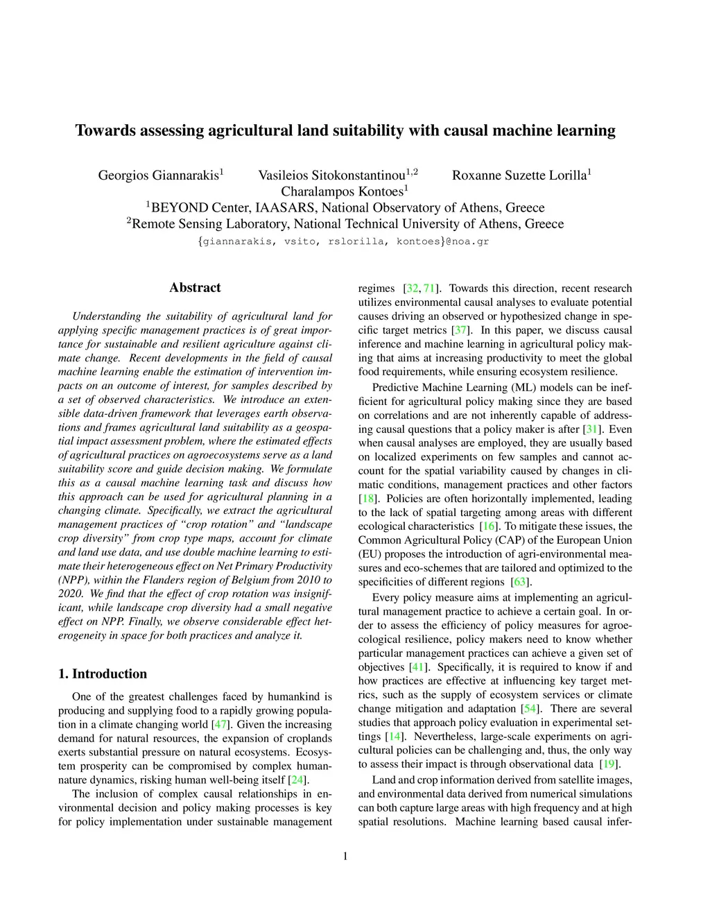 Understanding the suitability of agricultural land for applying specific management practices is of great importance for sustainable and resilient agriculture against climate change. Recent developments in the field of causal machine learning enable the estimation of intervention impacts on an outcome of interest, for samples described by a set of observed characteristics. We introduce an extensible data-driven framework that leverages earth observations and frames agricultural land suitability as a geospatial impact assessment problem, where the estimated effects of agricultural practices on agroecosystems serve as a land suitability score and guide decision making. We formulate this as a causal machine learning task and discuss how this approach can be used for agricultural planning in a changing climate. Specifically, we extract the agricultural management practices of "crop rotation" and "landscape crop diversity" from crop type maps, account for climate and land use data, and use double machine learning to estimate their heterogeneous effect on Net Primary Productivity (NPP), within the Flanders region of Belgium from 2010 to 2020. We find that the effect of crop rotation was insignificant, while landscape crop diversity had a small negative effect on NPP. Finally, we observe considerable effect heterogeneity in space for both practices and analyze it.