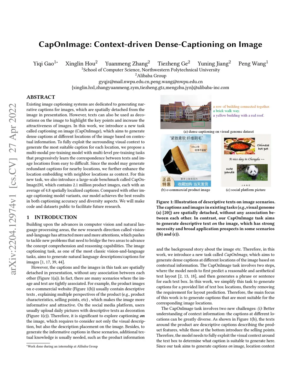 Existing image captioning systems are dedicated to generating narrative captions for images, which are spatially detached from the image in presentation. However, texts can also be used as decorations on the image to highlight the key points and increase the attractiveness of images. In this work, we introduce a new task called captioning on image (CapOnImage), which aims to generate dense captions at different locations of the image based on contextual information. To fully exploit the surrounding visual context to generate the most suitable caption for each location, we propose a multi-modal pre-training model with multi-level pre-training tasks that progressively learn the correspondence between texts and image locations from easy to difficult. Since the model may generate redundant captions for nearby locations, we further enhance the location embedding with neighbor locations as context. For this new task, we also introduce a large-scale benchmark called CapOnImage2M, which contains 2.1 million product images, each with an average of 4.8 spatially localized captions. Compared with other image captioning model variants, our model achieves the best results in both captioning accuracy and diversity aspects. We will make code and datasets public to facilitate future research.