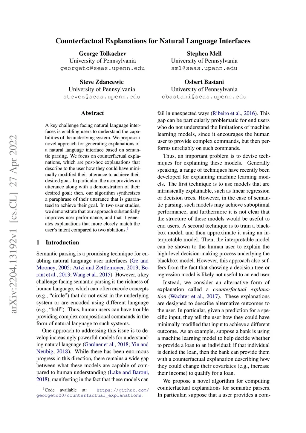 A key challenge facing natural language interfaces is enabling users to understand the capabilities of the underlying system. We propose a novel approach for generating explanations of a natural language interface based on semantic parsing. We focus on counterfactual explanations, which are post-hoc explanations that describe to the user how they could have minimally modified their utterance to achieve their desired goal. In particular, the user provides an utterance along with a demonstration of their desired goal; then, our algorithm synthesizes a paraphrase of their utterance that is guaranteed to achieve their goal. In two user studies, we demonstrate that our approach substantially improves user performance, and that it generates explanations that more closely match the user's intent compared to two ablations.