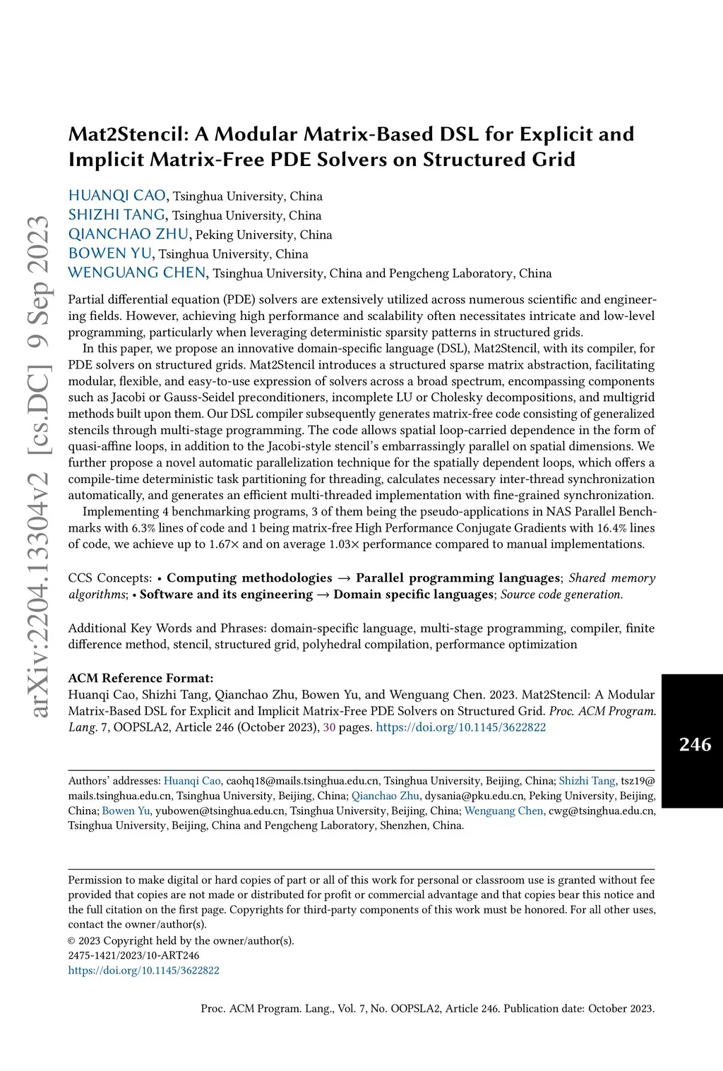 Partial differential equation (PDE) solvers are extensively utilized across numerous scientific and engineering fields. However, achieving high performance and scalability often necessitates intricate and low-level programming, particularly when leveraging deterministic sparsity patterns in structured grids. In this paper, we propose an innovative domain-specific language (DSL), Mat2Stencil, with its compiler, for PDE solvers on structured grids. Mat2Stencil introduces a structured sparse matrix abstraction, facilitating modular, flexible, and easy-to-use expression of solvers across a broad spectrum, encompassing components such as Jacobi or Gauss-Seidel preconditioners, incomplete LU or Cholesky decompositions, and multigrid methods built upon them. Our DSL compiler subsequently generates matrix-free code consisting of generalized stencils through multi-stage programming. The code allows spatial loop-carried dependence in the form of quasi-affine loops, in addition to the Jacobi-style stencil's embarrassingly parallel on spatial dimensions. We further propose a novel automatic parallelization technique for the spatially dependent loops, which offers a compile-time deterministic task partitioning for threading, calculates necessary inter-thread synchronization automatically, and generates an efficient multi-threaded implementation with fine-grained synchronization. Implementing 4 benchmarking programs, 3 of them being the pseudo-applications in NAS Parallel Benchmarks with lines of code and 1 being matrix-free High Performance Conjugate Gradients with lines of code, we achieve up to and on average performance compared to manual implementations.