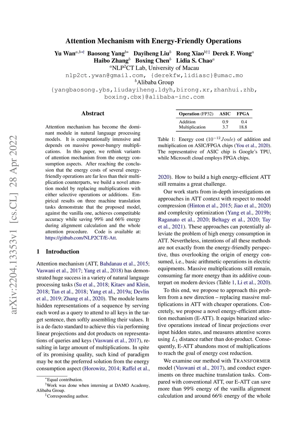 Attention mechanism has become the dominant module in natural language processing models. It is computationally intensive and depends on massive power-hungry multiplications. In this paper, we rethink variants of attention mechanism from the energy consumption aspects. After reaching the conclusion that the energy costs of several energy-friendly operations are far less than their multiplication counterparts, we build a novel attention model by replacing multiplications with either selective operations or additions. Empirical results on three machine translation tasks demonstrate that the proposed model, against the vanilla one, achieves competitable accuracy while saving 99\% and 66\% energy during alignment calculation and the whole attention procedure. Code is available at: https://github.com/NLP2CT/E-Att.