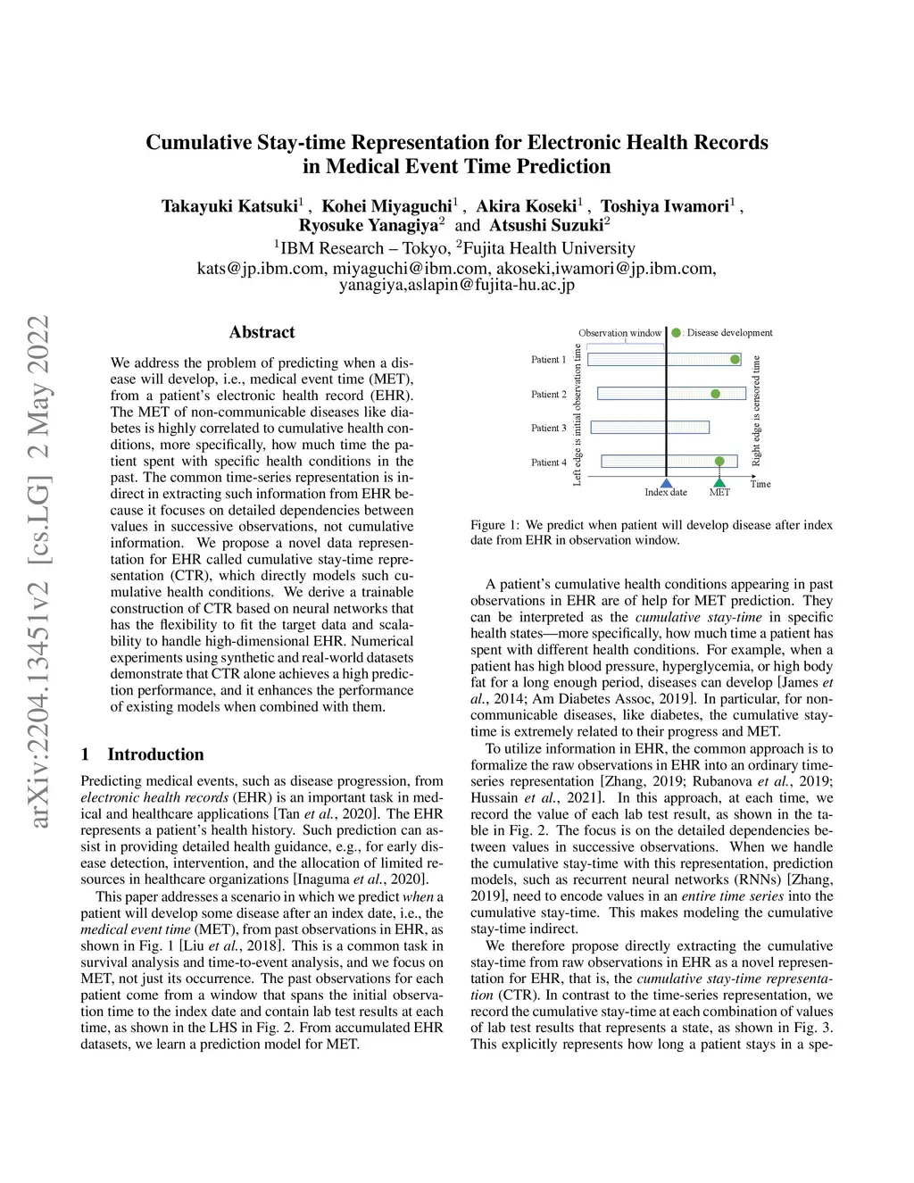 We address the problem of predicting when a disease will develop, i.e., medical event time (MET), from a patient's electronic health record (EHR). The MET of non-communicable diseases like diabetes is highly correlated to cumulative health conditions, more specifically, how much time the patient spent with specific health conditions in the past. The common time-series representation is indirect in extracting such information from EHR because it focuses on detailed dependencies between values in successive observations, not cumulative information. We propose a novel data representation for EHR called cumulative stay-time representation (CTR), which directly models such cumulative health conditions. We derive a trainable construction of CTR based on neural networks that has the flexibility to fit the target data and scalability to handle high-dimensional EHR. Numerical experiments using synthetic and real-world datasets demonstrate that CTR alone achieves a high prediction performance, and it enhances the performance of existing models when combined with them.