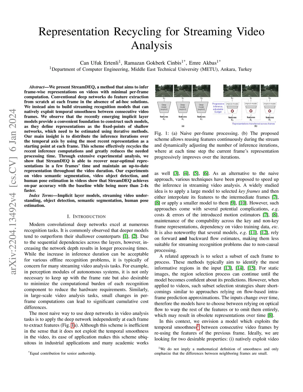 We present StreamDEQ, a method that aims to infer frame-wise representations on videos with minimal per-frame computation. Conventional deep networks do feature extraction from scratch at each frame in the absence of ad-hoc solutions. We instead aim to build streaming recognition models that can natively exploit temporal smoothness between consecutive video frames. We observe that the recently emerging implicit layer models provide a convenient foundation to construct such models, as they define representations as the fixed-points of shallow networks, which need to be estimated using iterative methods. Our main insight is to distribute the inference iterations over the temporal axis by using the most recent representation as a starting point at each frame. This scheme effectively recycles the recent inference computations and greatly reduces the needed processing time. Through extensive experimental analysis, we show that StreamDEQ is able to recover near-optimal representations in a few frames' time and maintain an up-to-date representation throughout the video duration. Our experiments on video semantic segmentation, video object detection, and human pose estimation in videos show that StreamDEQ achieves on-par accuracy with the baseline while being more than 2-4x faster.