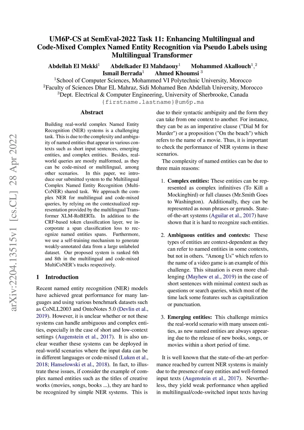 UM6P-CS at SemEval-2022 Task 11: Enhancing Multilingual and Code-Mixed