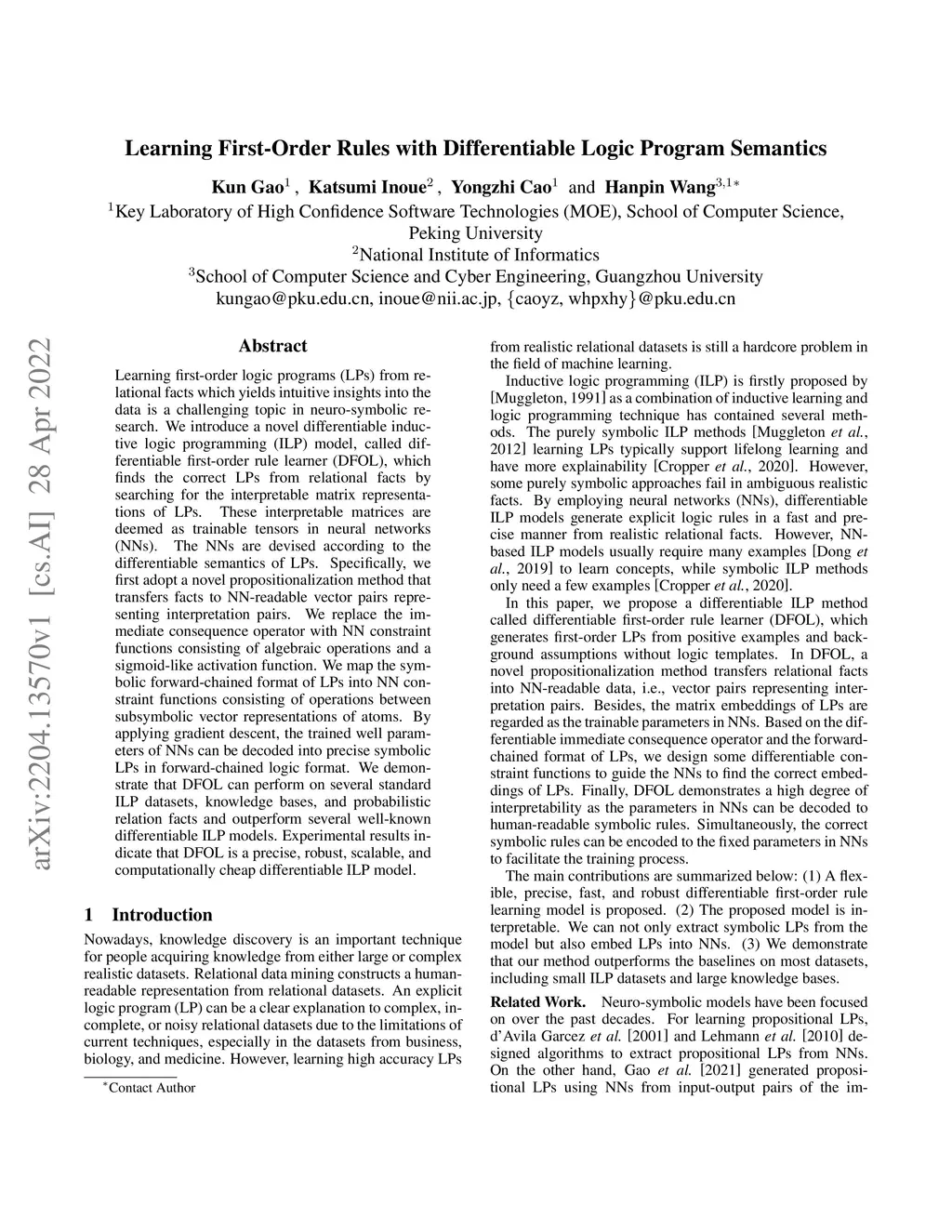 Learning first-order logic programs (LPs) from relational facts which yields intuitive insights into the data is a challenging topic in neuro-symbolic research. We introduce a novel differentiable inductive logic programming (ILP) model, called differentiable first-order rule learner (DFOL), which finds the correct LPs from relational facts by searching for the interpretable matrix representations of LPs. These interpretable matrices are deemed as trainable tensors in neural networks (NNs). The NNs are devised according to the differentiable semantics of LPs. Specifically, we first adopt a novel propositionalization method that transfers facts to NN-readable vector pairs representing interpretation pairs. We replace the immediate consequence operator with NN constraint functions consisting of algebraic operations and a sigmoid-like activation function. We map the symbolic forward-chained format of LPs into NN constraint functions consisting of operations between subsymbolic vector representations of atoms. By applying gradient descent, the trained well parameters of NNs can be decoded into precise symbolic LPs in forward-chained logic format. We demonstrate that DFOL can perform on several standard ILP datasets, knowledge bases, and probabilistic relation facts and outperform several well-known differentiable ILP models. Experimental results indicate that DFOL is a precise, robust, scalable, and computationally cheap differentiable ILP model.