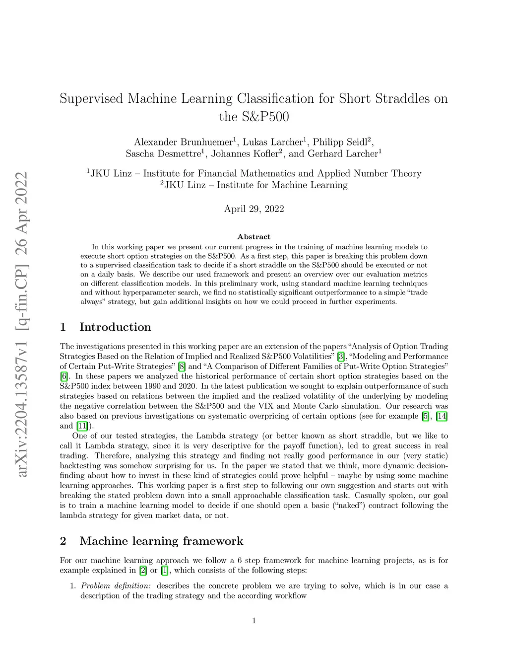 In this working paper we present our current progress in the training of machine learning models to execute short option strategies on the S&P500. As a first step, this paper is breaking this problem down to a supervised classification task to decide if a short straddle on the S&P500 should be executed or not on a daily basis. We describe our used framework and present an overview over our evaluation metrics on different classification models. In this preliminary work, using standard machine learning techniques and without hyperparameter search, we find no statistically significant outperformance to a simple "trade always" strategy, but gain additional insights on how we could proceed in further experiments.