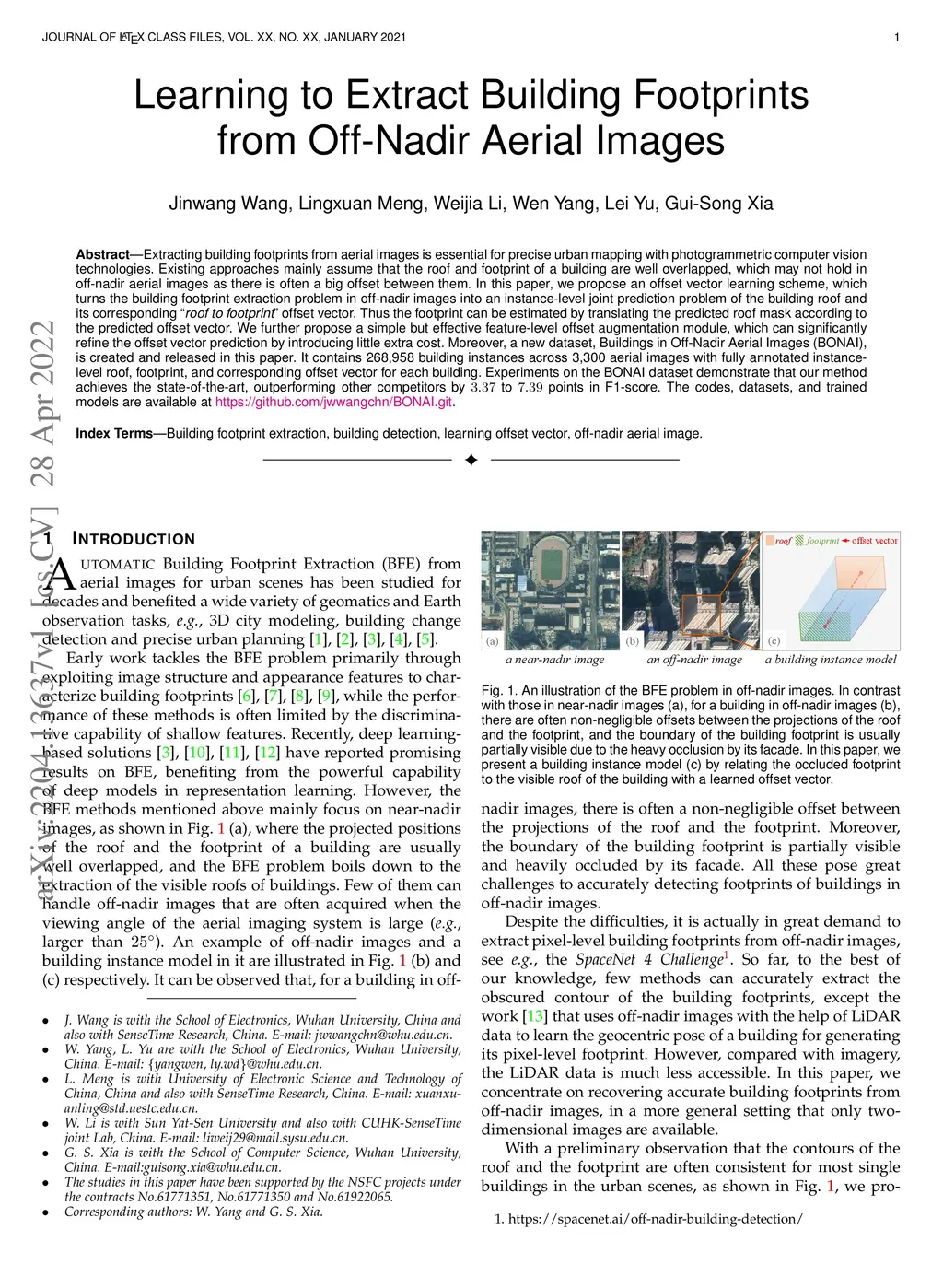 Extracting building footprints from aerial images is essential for precise urban mapping with photogrammetric computer vision technologies. Existing approaches mainly assume that the roof and footprint of a building are well overlapped, which may not hold in off-nadir aerial images as there is often a big offset between them. In this paper, we propose an offset vector learning scheme, which turns the building footprint extraction problem in off-nadir images into an instance-level joint prediction problem of the building roof and its corresponding "roof to footprint" offset vector. Thus the footprint can be estimated by translating the predicted roof mask according to the predicted offset vector. We further propose a simple but effective feature-level offset augmentation module, which can significantly refine the offset vector prediction by introducing little extra cost. Moreover, a new dataset, Buildings in Off-Nadir Aerial Images (BONAI), is created and released in this paper. It contains 268,958 building instances across 3,300 aerial images with fully annotated instance-level roof, footprint, and corresponding offset vector for each building. Experiments on the BONAI dataset demonstrate that our method achieves the state-of-the-art, outperforming other competitors by 3.37 to 7.39 points in F1-score. The codes, datasets, and trained models are available at https://github.com/jwwangchn/BONAI.git.