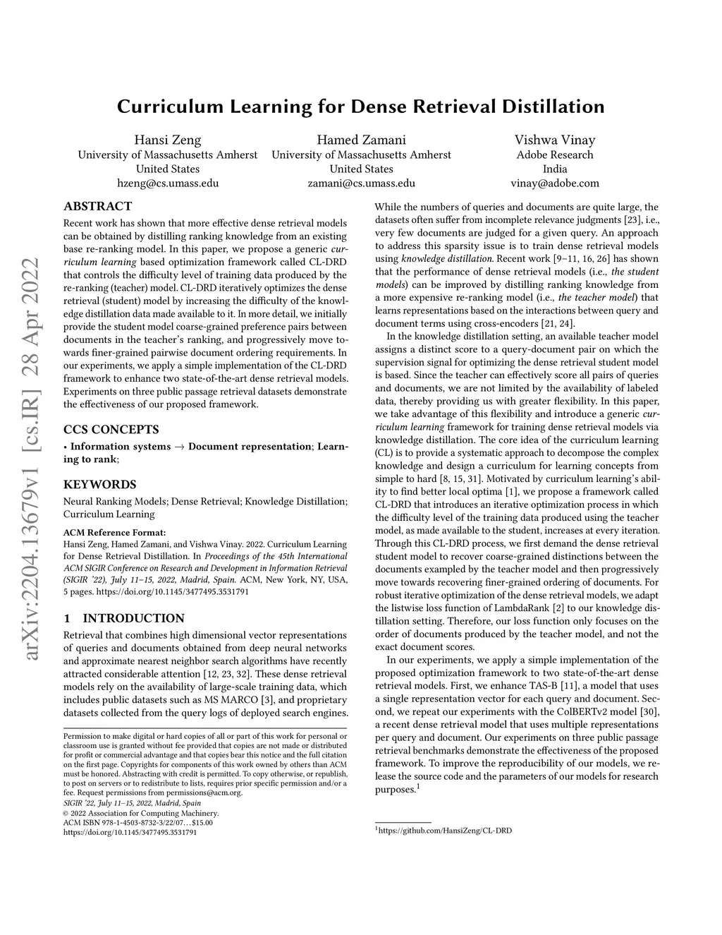 Curriculum Learning for Dense Retrieval Distillation