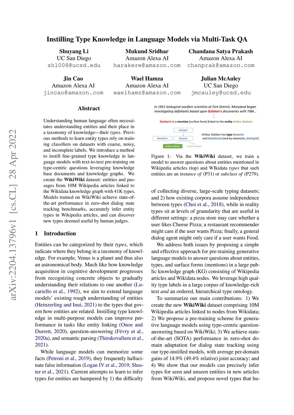 Understanding human language often necessitates understanding entities and their place in a taxonomy of knowledge -- their types. Previous methods to learn entity types rely on training classifiers on datasets with coarse, noisy, and incomplete labels. We introduce a method to instill fine-grained type knowledge in language models with text-to-text pre-training on type-centric questions leveraging knowledge base documents and knowledge graphs. We create the WikiWiki dataset: entities and passages from 10M Wikipedia articles linked to the Wikidata knowledge graph with 41K types. Models trained on WikiWiki achieve state-of-the-art performance in zero-shot dialog state tracking benchmarks, accurately infer entity types in Wikipedia articles, and can discover new types deemed useful by human judges.