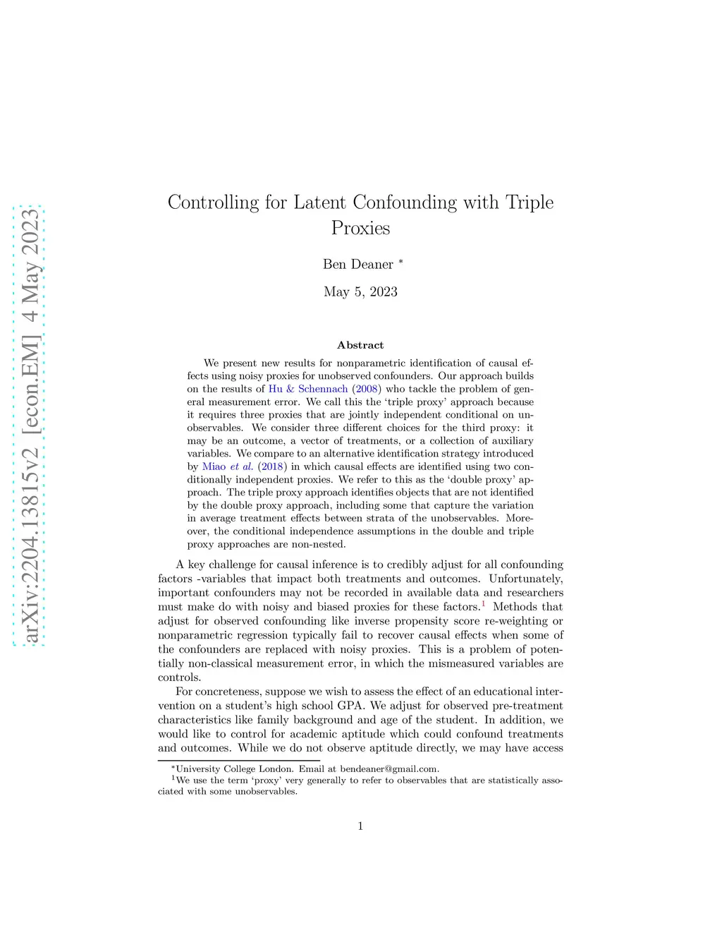 We present new results for nonparametric identification of causal effects using noisy proxies for unobserved confounders. Our approach builds on the results of \citet{Hu2008} who tackle the problem of general measurement error. We call this the `triple proxy' approach because it requires three proxies that are jointly independent conditional on unobservables. We consider three different choices for the third proxy: it may be an outcome, a vector of treatments, or a collection of auxiliary variables. We compare to an alternative identification strategy introduced by \citet{Miao2018a} in which causal effects are identified using two conditionally independent proxies. We refer to this as the `double proxy' approach. The triple proxy approach identifies objects that are not identified by the double proxy approach, including some that capture the variation in average treatment effects between strata of the unobservables. Moreover, the conditional independence assumptions in the double and triple proxy approaches are non-nested.