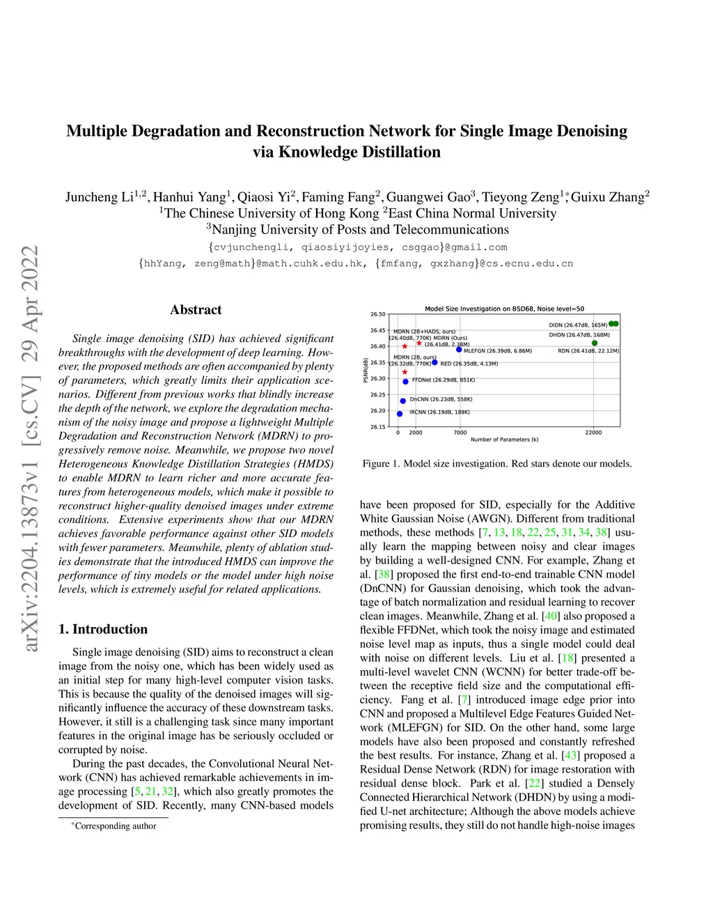 Single image denoising (SID) has achieved significant breakthroughs with the development of deep learning. However, the proposed methods are often accompanied by plenty of parameters, which greatly limits their application scenarios. Different from previous works that blindly increase the depth of the network, we explore the degradation mechanism of the noisy image and propose a lightweight Multiple Degradation and Reconstruction Network (MDRN) to progressively remove noise. Meanwhile, we propose two novel Heterogeneous Knowledge Distillation Strategies (HMDS) to enable MDRN to learn richer and more accurate features from heterogeneous models, which make it possible to reconstruct higher-quality denoised images under extreme conditions. Extensive experiments show that our MDRN achieves favorable performance against other SID models with fewer parameters. Meanwhile, plenty of ablation studies demonstrate that the introduced HMDS can improve the performance of tiny models or the model under high noise levels, which is extremely useful for related applications.