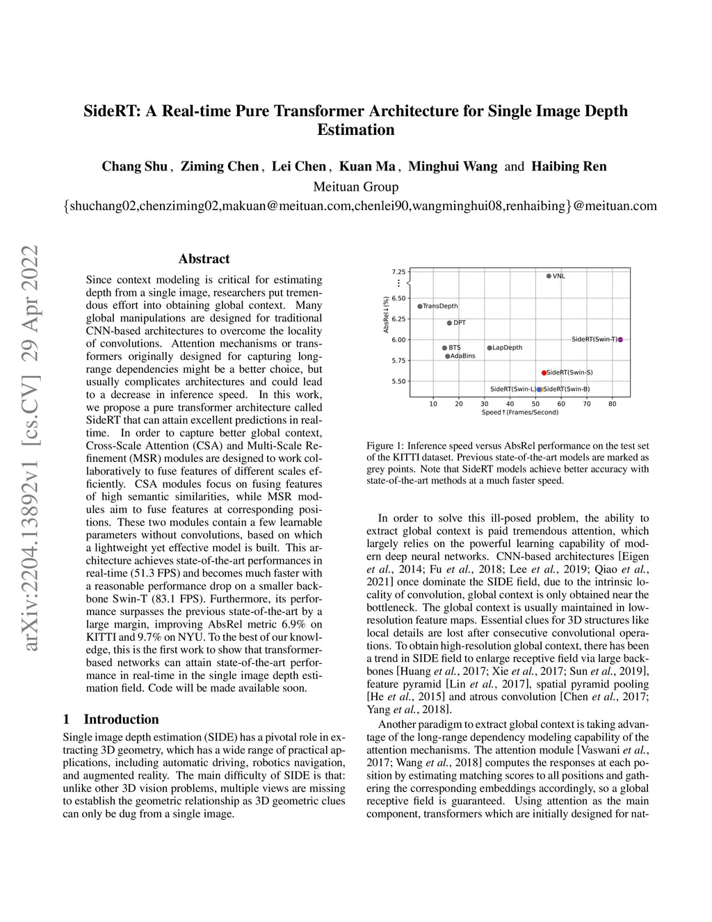 SideRT: A Real-time Pure Transformer Architecture for Single Image Depth