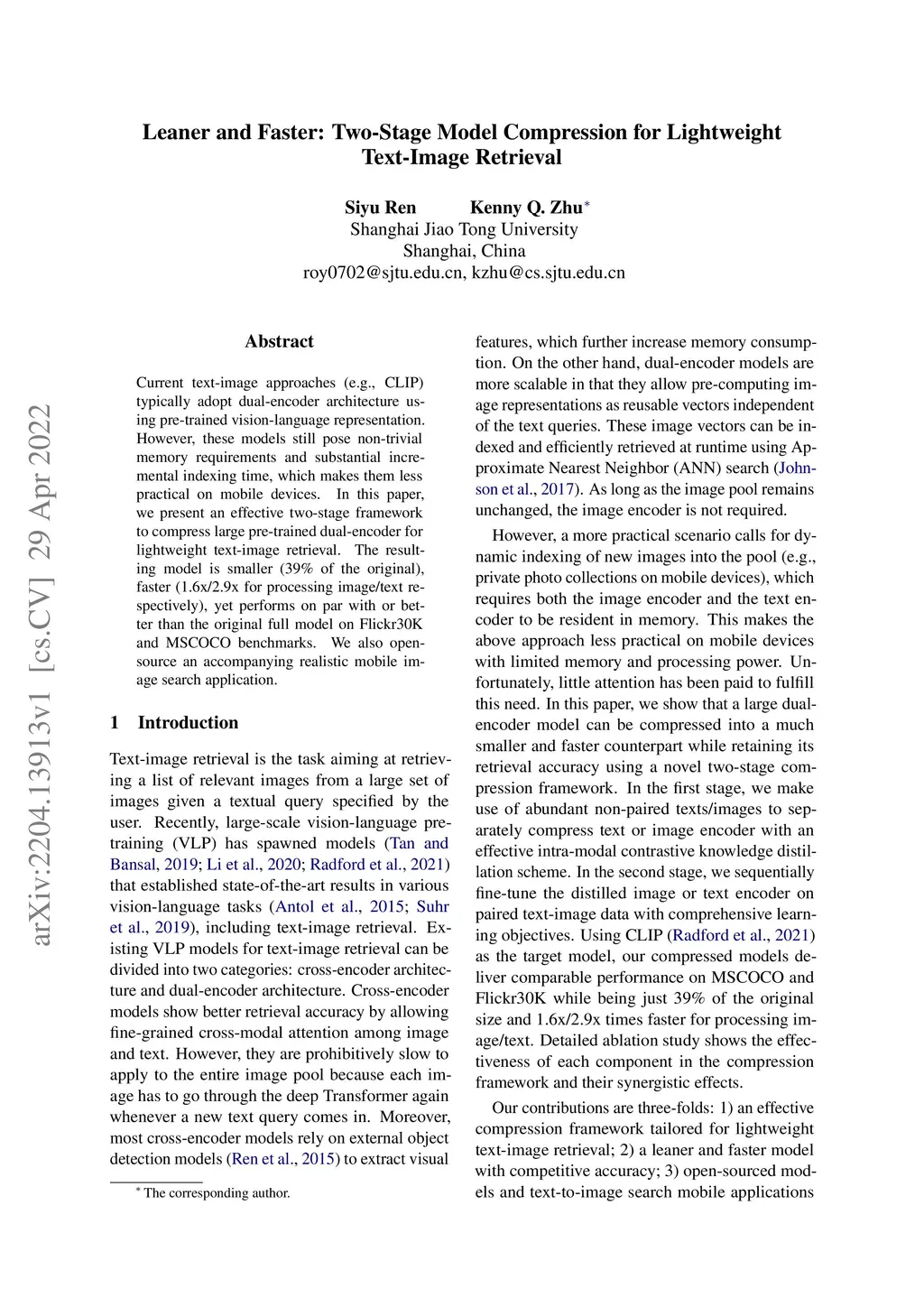 Current text-image approaches (e.g., CLIP) typically adopt dual-encoder architecture using pre-trained vision-language representation. However, these models still pose non-trivial memory requirements and substantial incremental indexing time, which makes them less practical on mobile devices. In this paper, we present an effective two-stage framework to compress large pre-trained dual-encoder for lightweight text-image retrieval. The resulting model is smaller (39% of the original), faster (1.6x/2.9x for processing image/text respectively), yet performs on par with or better than the original full model on Flickr30K and MSCOCO benchmarks. We also open-source an accompanying realistic mobile image search application.