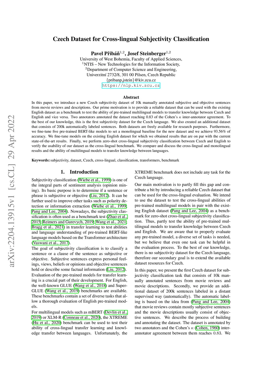 In this paper, we introduce a new Czech subjectivity dataset of 10k manually annotated subjective and objective sentences from movie reviews and descriptions. Our prime motivation is to provide a reliable dataset that can be used with the existing English dataset as a benchmark to test the ability of pre-trained multilingual models to transfer knowledge between Czech and English and vice versa. Two annotators annotated the dataset reaching 0.83 of the Cohen's \k{appa} inter-annotator agreement. To the best of our knowledge, this is the first subjectivity dataset for the Czech language. We also created an additional dataset that consists of 200k automatically labeled sentences. Both datasets are freely available for research purposes. Furthermore, we fine-tune five pre-trained BERT-like models to set a monolingual baseline for the new dataset and we achieve 93.56% of accuracy. We fine-tune models on the existing English dataset for which we obtained results that are on par with the current state-of-the-art results. Finally, we perform zero-shot cross-lingual subjectivity classification between Czech and English to verify the usability of our dataset as the cross-lingual benchmark. We compare and discuss the cross-lingual and monolingual results and the ability of multilingual models to transfer knowledge between languages.