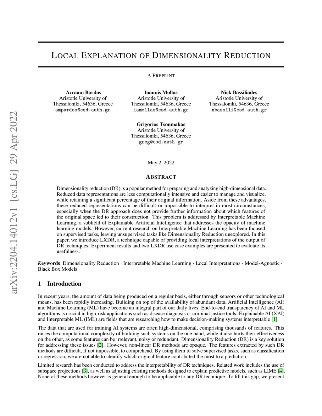 Dimensionality reduction (DR) is a popular method for preparing and analyzing high-dimensional data. Reduced data representations are less computationally intensive and easier to manage and visualize, while retaining a significant percentage of their original information. Aside from these advantages, these reduced representations can be difficult or impossible to interpret in most circumstances, especially when the DR approach does not provide further information about which features of the original space led to their construction. This problem is addressed by Interpretable Machine Learning, a subfield of Explainable Artificial Intelligence that addresses the opacity of machine learning models. However, current research on Interpretable Machine Learning has been focused on supervised tasks, leaving unsupervised tasks like Dimensionality Reduction unexplored. In this paper, we introduce LXDR, a technique capable of providing local interpretations of the output of DR techniques. Experiment results and two LXDR use case examples are presented to evaluate its usefulness.